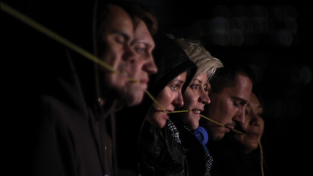 Mit tiefsitzenden Männlichkeitsritualen beschäftigt sich die Performance K3: Ein grell beleuchtetes, weißes Leinen liegt in der Mitte des Bodens eines dunklen Raums. Zwei lange Holzstücke sind parallel zu den Rändern des Stoffes ausgelegt. Ein verzerrtes Geräusch von Peitschenhieben hallt durch den Raum. Der Rhythmus und das Schnalzen der Peitschenhiebe verlangsamen sich schließlich. In einer der Pausen tritt der Künstler, begleitet von einem Assistenten, aus dem Publikum nach vorne. Beide treten in das Schweinwerferlicht und entblößen ihren Oberkörper. Dann nehmen sie die Stöcke in die Hand und stellen sich für den Schlag auf. Im selben Moment schlagen sie sich gegenseitig mit aller Kraft auf den Rücken. Sie ziehen ihre Kleider wieder an und gehen weg. |