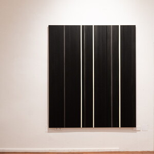 Zlatko Koplljar: Disturbances, 2021–24, 10 tlg., Öl auf Leinwand, Ausstellungsansicht: Zlatko Kopljar: AUSLÖSCHUNG | ERASION. KULTUMUSEUM GrazAuf den ersten Blick knüpfen seine Gemälde in der abstrakten Farbfeldmalerei der 1960er und 1970er Jahre an. Ein genaueres Hinsehen auf die malerische Gestaltung seiner Gemälde verrät freilich mehr. Ging es dort um die Auslöschung der künstlerischen Handschrift, sind die Farbstreifen in Zlatko Kopljars in Wirklichkeit höchst erzählerisch: In einem kleinen Farbausschnitt der einzelnen Farbstreifen kann man die stunden-, tage- und wochenlange Arbeit des Malers Zlatko Kopljar erahnen. Er macht seither tatsächlich nichts anderes, als täglich auf diese Art zu malen. Dass er die Malereien „Störungen“ nennt, zeugt von der Brücke zu seinem bisherigen Lebenswerk.