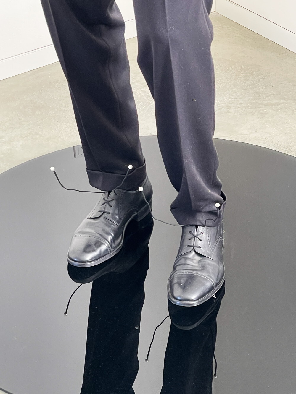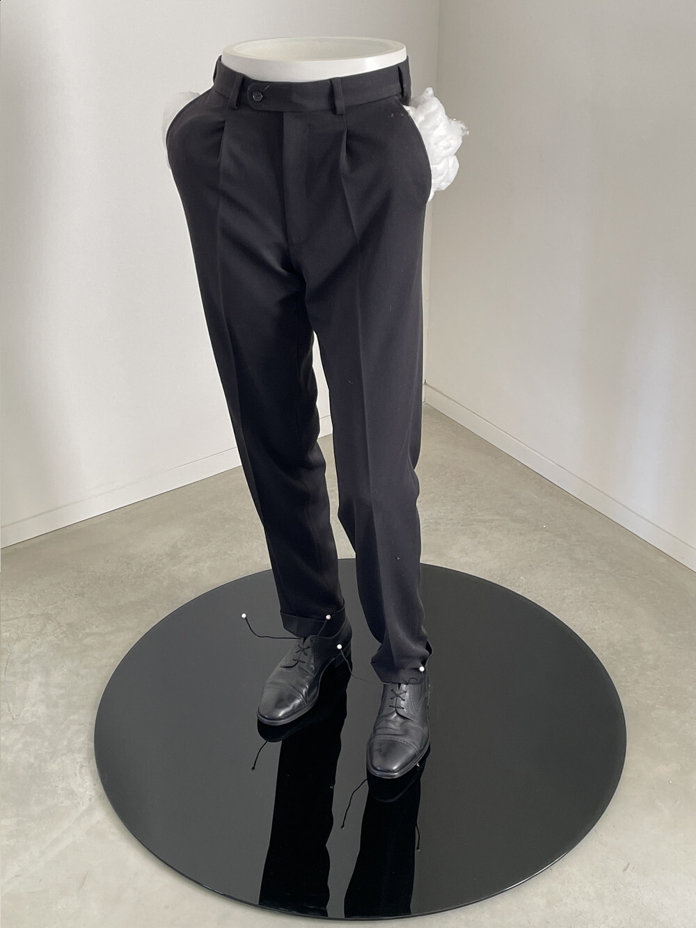 Zlatko Kopljar: Vinculum I, 1995, Männliche Schaufensterpuppe: Beine, Hose, Schuhe, Perlen, Baumwolle, blaue Flüssigkeit, rundes schwarzes Glas, Ausstellungsansicht: Zlatko Kopljar: AUSLÖSCHUNG | ERASION. KULTUMUSEUM GrazDer schwarze (und dann später leuchtend weiße) Anzug wird später zu einem Markenzeichen seiner Performances. Dem schlanken, jungen Mann fehlt freilich der Oberkörper, dafür hat er Antennen an seinen Füßen.