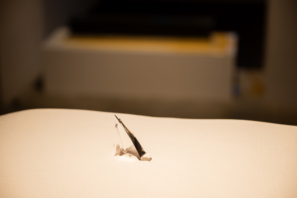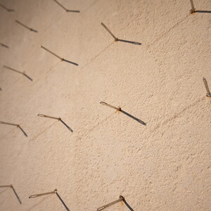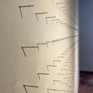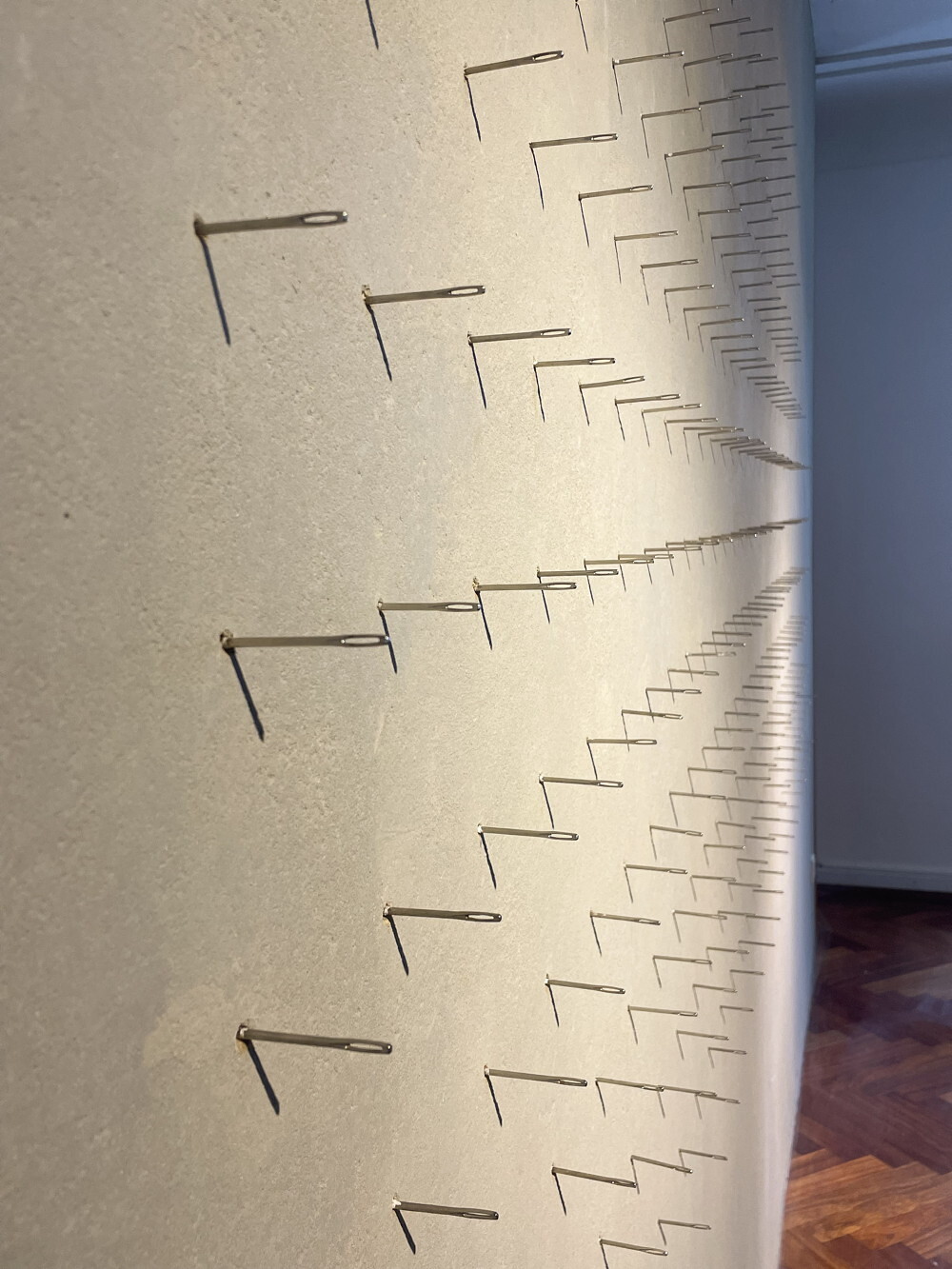 Das ist Glaube. Mehr als ein Jahrzehnt vorher, am Beginn seines öffentlichen künstlerischen Schaffens, rammt Zlatko Kopljar eine ganze Serie großer Nadeln in die Wand, ohne Zwirn, ohne Faden. Die Installation ist auf der Lehmwand im großen Ausstellungsraum im Westflügel vor dem Cubus aufgebaut: I believe ist ein „Bekenntnis“, das man als Kunstwerk selten findet.