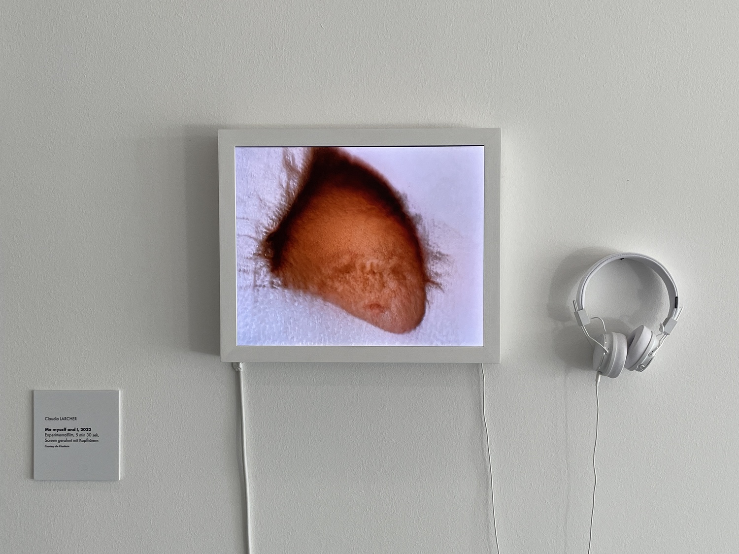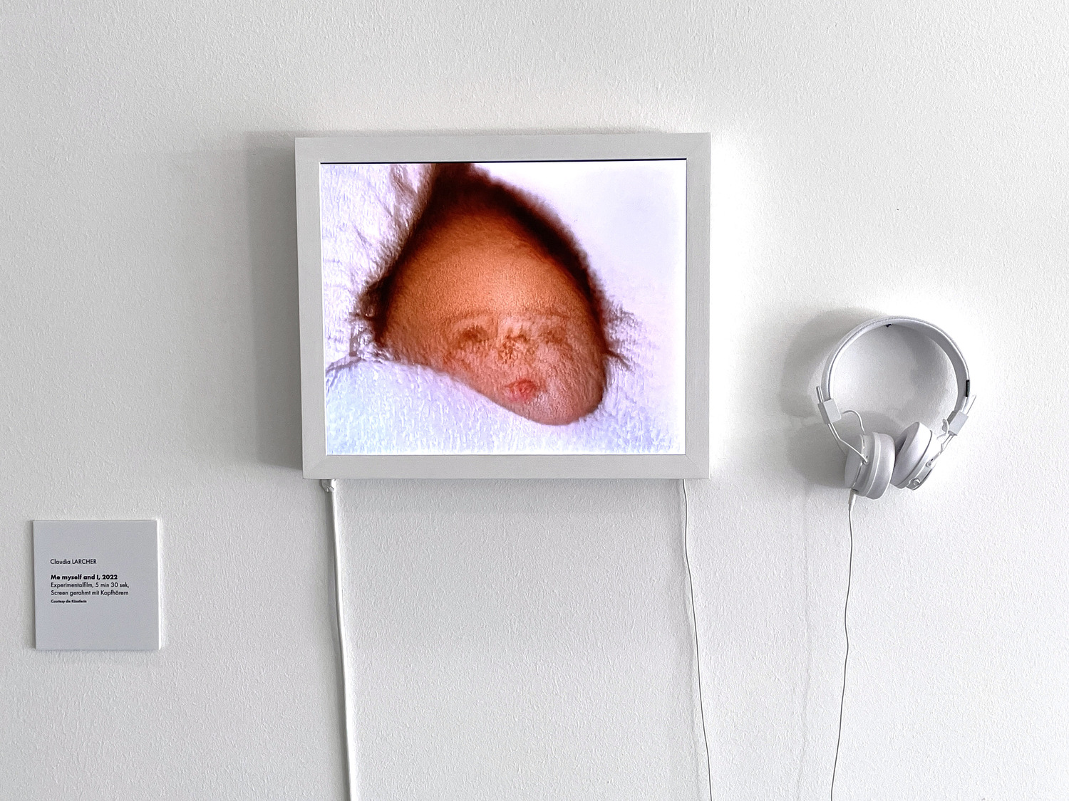 Claudia Larchers „Me, Myself and I“ tut nichts weniger, als dieses zersplitternde und gleichzeitig re-synthetisierende Moment in produktive Kollision miteinander zu bringen. Die Versuchsanordnung dazu ist so einfach wie bestechend: Larcher hat ein GAN (Generative Adversarial Network) mit 350 Fotografien von sich selbst (bis zum Alter von 24 Jahren) gefüttert, woraus ein sich ständig verformender Strom von Bildern resultiert, der über die ursprünglichen Fotos hinaus noch weitere Ansichten von Identität enthält. Babygesicht, Mädchenkopf, junge Frau, fast vorwärts ins Alter und wieder zurück ins Kleinkindhafte – all dies in einem sich ständig wandelnden Strom, der unmerklich das eine in das andere übergehen lässt. So wird ein digital vermitteltes Werden inszeniert, das sowohl auf ein produktives Verschwinden als auch auf eine ständige Neuerschaffung verweist – die Auslöschung alles Bisherigen bis hin zur völligen Abstraktion bei gleichzeitiger Wiederherstellung und Vorwegnahme des Kommenden. Groteske Verformung trifft auf grimassierende Neuausrichtung, organisch-synthetisch-hybrid, mit wiederholten Einblendungen von lächerlicher Gesichtskomik, wie man sie von Snapchat und anderen Bildbearbeitungsfiltern kennt.