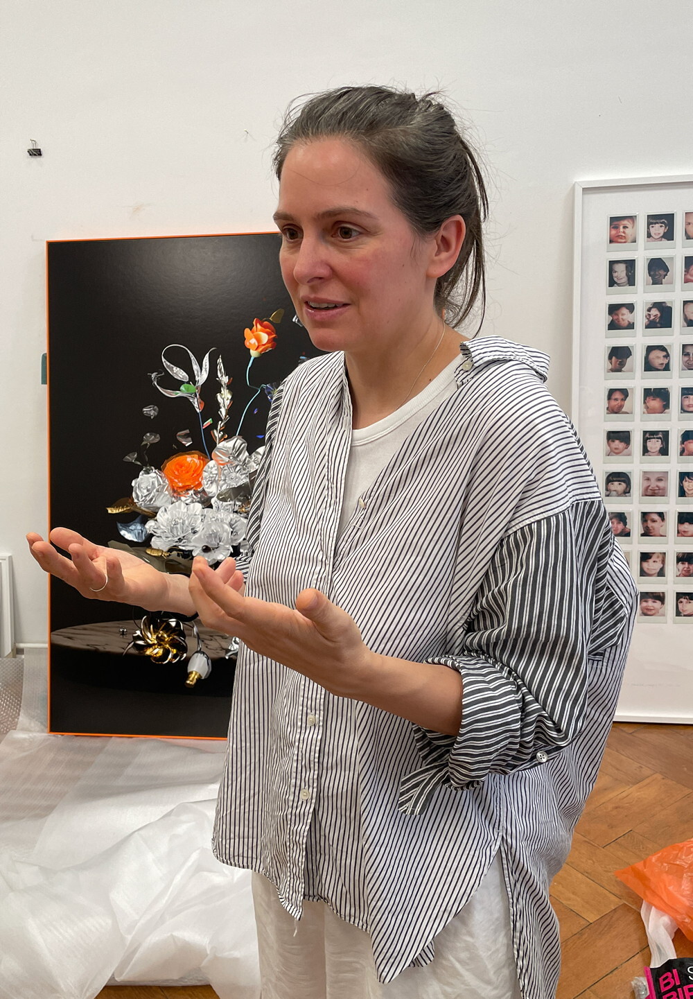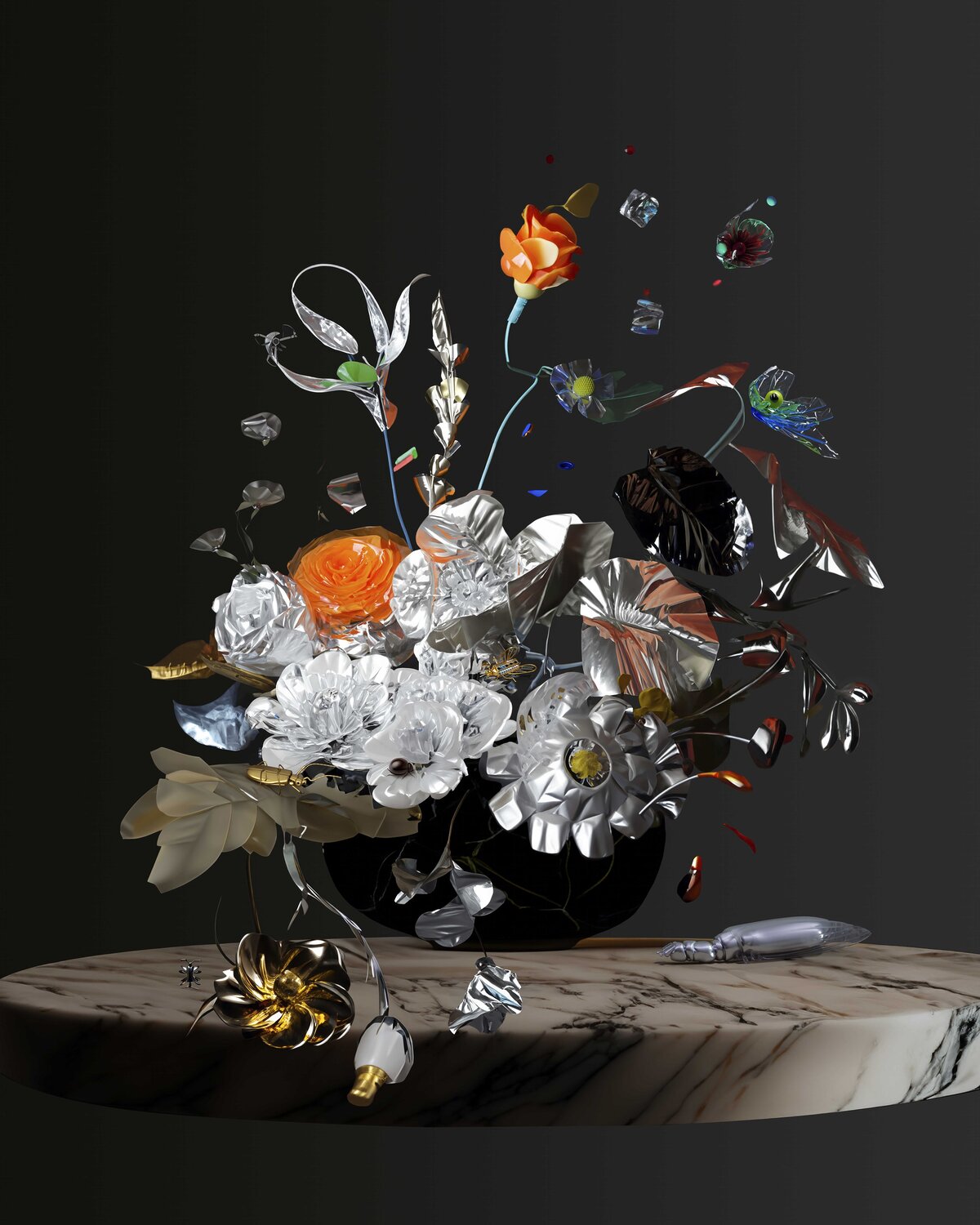 Larcher verwendet Kunstblumen aus Plastik, die in ihrer unvergänglichen Perfektion den Zeitgeist des 21. Jahrhunderts widerspiegeln und auf ökologische Herausforderungen unserer Zeit hinweisen. Die Einbindung einer technoiden Bienendrohne betont die komplizierte Beziehung zwischen Natur und Technologie in einer Welt, die von Klimawandel und dem Verlust der Artenvielfalt bedroht ist. Schließlich finden sich zeitgenössischer Artefakte wie etwa iPhoneähnliche Accessoires in die Serie integriert, die sowohl den Geist der modernen Lebensweiseverkörpern als auch den Zyklus von Vergänglichkeit und Erneuerung thematisieren.
