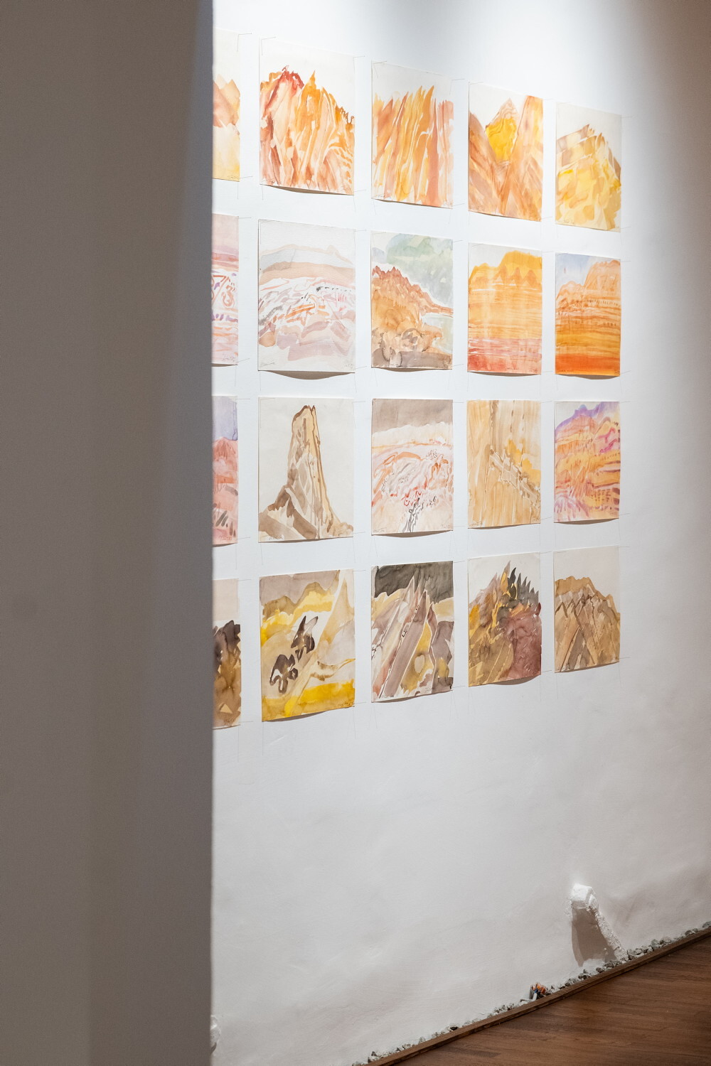 Seit den frühen 1980er Jahren reist Josef Fink – meist bedingt durch seine zahlreichen Dreharbeiten mit Jos Rosenthal – regelmäßig nach Israel/Palästina. Hier findet er seine Sehnsuchtsorte vor allem die Wüste Negev, die Gegend um das Tote Meer, die Bucht zum Roten Meer um Nuweiba und die Wüste Sinai insgesamt. Fink ist fasziniert von den Gesteinsformationen, ihre farbliche Prägnanz im Spektrum von Ocker und Rot. In dieser Zeit entstehen hunderte Werke, die er zunächst vor Ort und später in größeren Formaten im Atelier anfertigt.