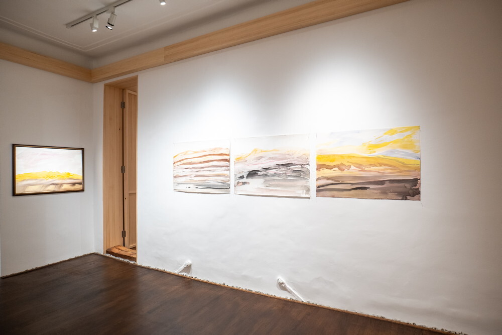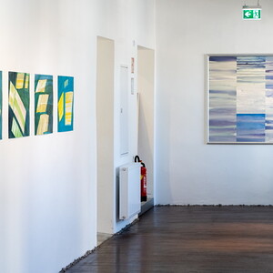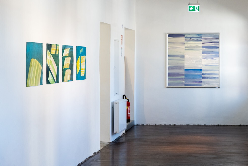Die grünen Felder der Oststeiermark im Sommer, mit ihrem charakteristischen Kukuruz, haben es Josef Fink besonders angetan. Mehrfach setzt er sich malerisch mit ihnen auseinander. Die Sommermonate verbringt er, wenn er nicht in Israel ist, auf seiner Keusche in Katzendorf bei Gnas. Dort malt er jeweils in Serie. Die strenge Strukturierung mittels breiter Pinselstriche in den Aquarellen entstammt der Reduktion der Felder und ihrer aus der Vogelperspektive erfassten Muster. Gelb-Grün, aber auch erdiges Braun-Rot sind hier dominant. Der Abstraktionsprozess mündet in Darstellungen, in denen die Rechteckform der blau grundierten Blätter die Oberhand gewinnt – vor dem monochromen Grund entfalten sich die geometrischen Formen der Felder im freien Spiel zueinander. Dieser hohe Abstraktionsgrad wird auch in einer Serie von Blättern erreicht, in denen einzelne mit Pinsel ausgeführte Strichlagen sich vor hellem grauen Grund scheinbar zufällig bündeln und bei der Betrachtung den Eindruck des Landschaftlichen hinterlassen.