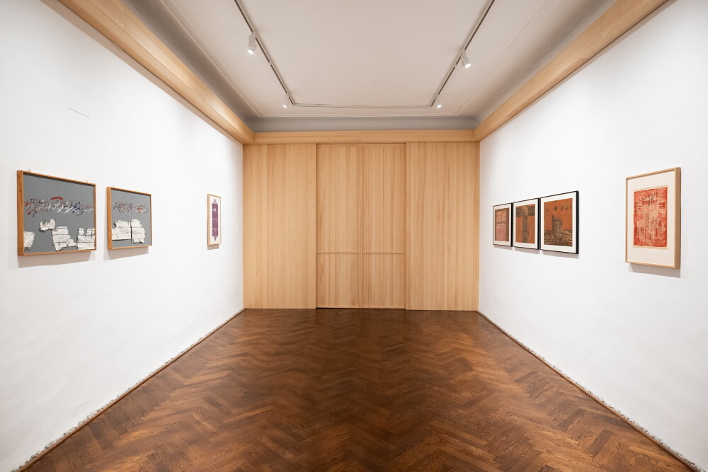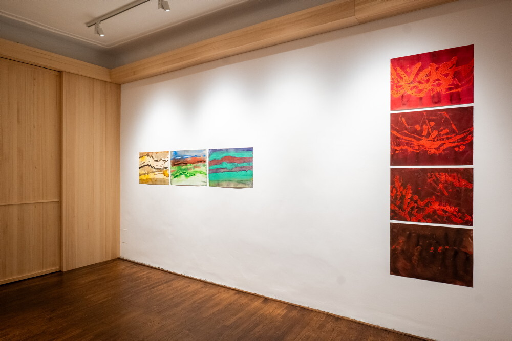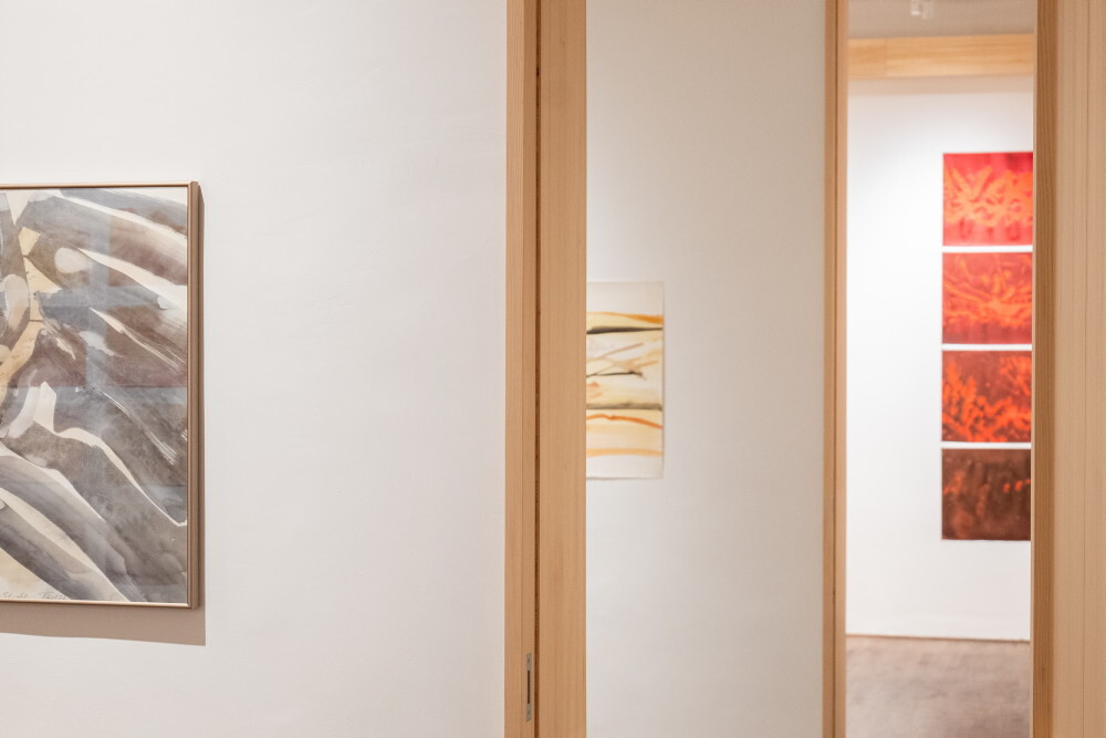 Rot leuchten die vertikal angeordneten Bilder aus dem Zyklus „Post Festum – nach der Säge“ einem entgegen. Dabei handelt es sich um ein erschütterndes Dokument aus der Zeit, in der Fink beide Beine amputiert werden. Sie entstehen quasi im Delirium: „dumpfe, hektisch aufgetragene Farbschichten, vor allem aber Rot in Rot gehaltene Blätter, in denen aus dem schmerzerfüllten, purpurnen Grund ausgeschlagene, verfließende Flecken wie hellrote Blutgerinnsel aufleuchten.“