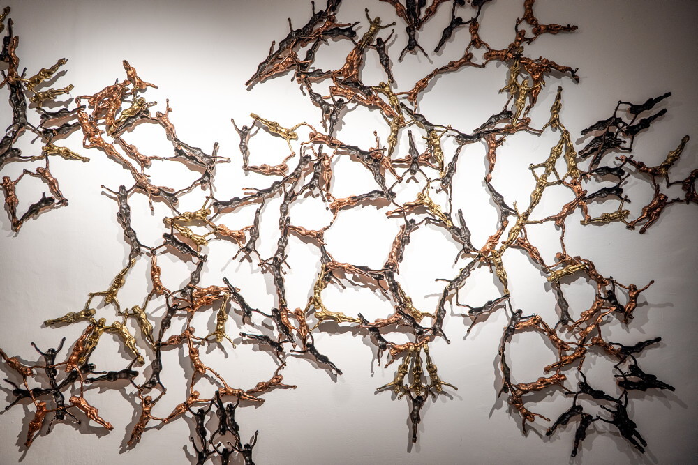 Hermann Glettler,  * 1965 in Übelbach (AT), lebt in Innsbruck (AT)crossfit, 2015/25,  Sargkreuze, verschweißt, Maße variabel,  KULTUMUSEUM Graz, aus: reliqte, reloaded. Zum Erbe christlicher Bildwelte heute (2015) und GOTT HAT KEIN MUSEUM. Aspekte vo