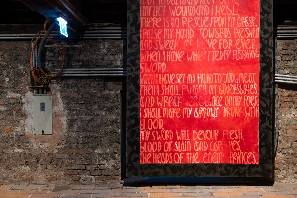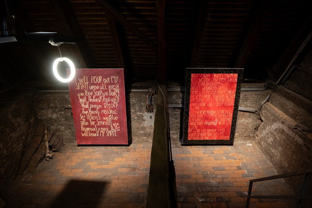 Hannes Priesch*1954 in Volkersdorf (AT), lebt in  Semriach (AT), God‘s Statement (Deut. 32: 39-42), 2004, Acryl auf Baumwollgewebe, 228,5 x 152,5 cm, Courtesy des Künstlers