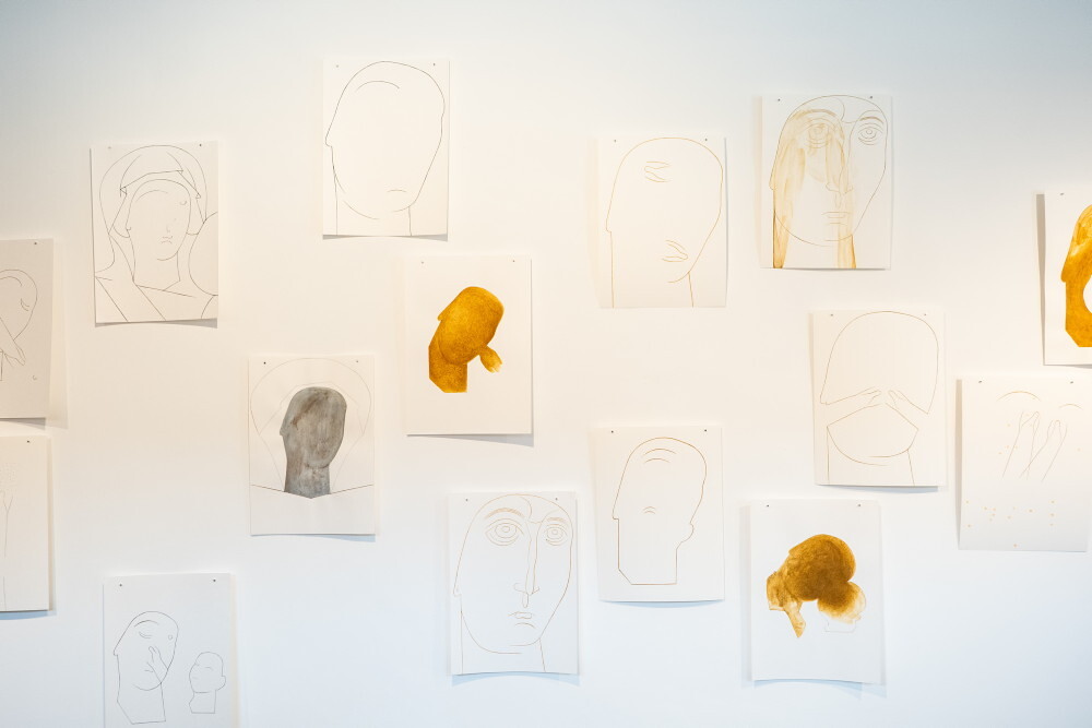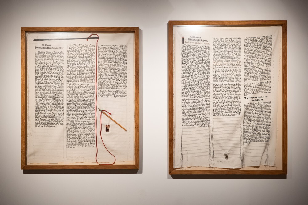 Hannes Priesch, *1954 in Volkersdorf (AT), lebt in  Semriach (AT), Sebastian, Agnes, aus: Göttlicher Humor, 2017, Reliquien: Blut, Pfeilspitzen, Kordel; 98 × 81 cm,Reliquien: Blut, Haare; 106 × 81 cm,Bleistift, Acrylstifte auf Naturseide, Reli