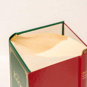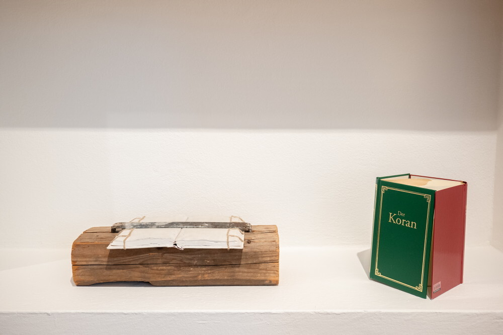 Gerhard Lojen, * 1935 in Graz (AT), + 2006 in Graz (AT), Buchobjekt, ca. 1990, Buch, Farbe, Holzstück, Eisenklammer, Spagat, 18,5 x 42,5 x 10,3 cm, KULTUMUSEUM Graz, aus: Hommage à Gerhard Lojen (2006/07) und Dort, wo unsere Sprache endet, komme i