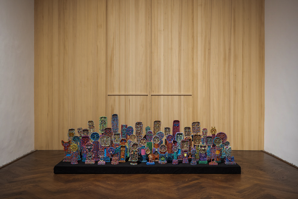 Alois Neuhold, *1951 in Eggersdorf (AT), lebt in Baldau (AT), Abfall-Seelen einer Achtloswelt ­– Lautloser Aufstand farblichtgeballt – Eine Anblick-Armee, „Jüngstes Gericht“... 2020-2024, 49 tlg., Abfallmaterial, Karton, Acryl, Courtesy des Künst