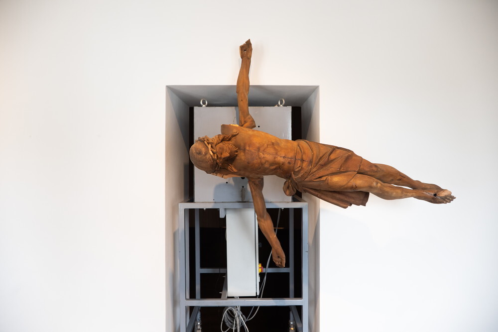 Manfred Erjautz, * 1966 in Graz (AT), lebt in Wien (AT), Your Own Personal Jesus, 2012–16, Durch das Funksignal (DCF 77) des Langwellensenders in Mainflingen gesteuerte Turmuhr mit schleichender Sekunde; Christus-Corpus, geschnitzt, mit Bier getönt