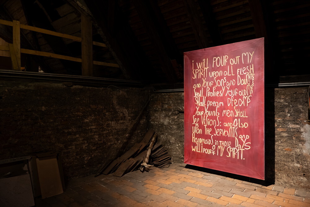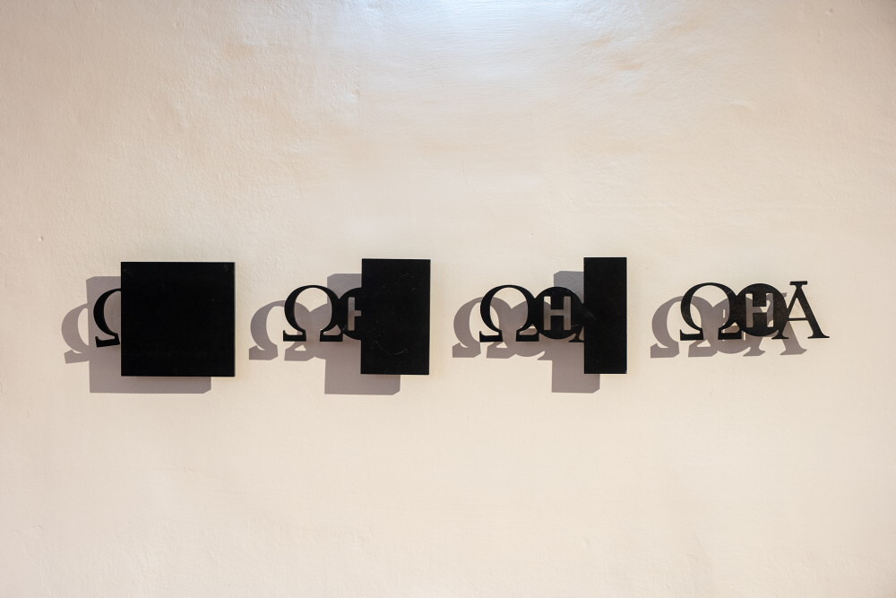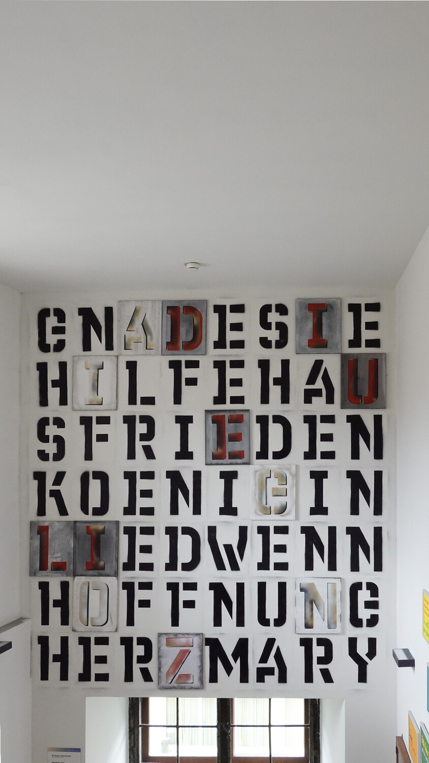 Michael Endlicher* 1961 in Wien (AT), lebt in Wien (AT)HERZMARY, 2024, Wandinstallation, Sprühlack, 12 Buchstabenbilder (Sprühlack, Acryl/Lwd.), ca 370 x 327 cm, KULTUMUSEUM Graz, aus: Michael Endlicher: ZEICHEN SPRACHE IRONIE (2024)