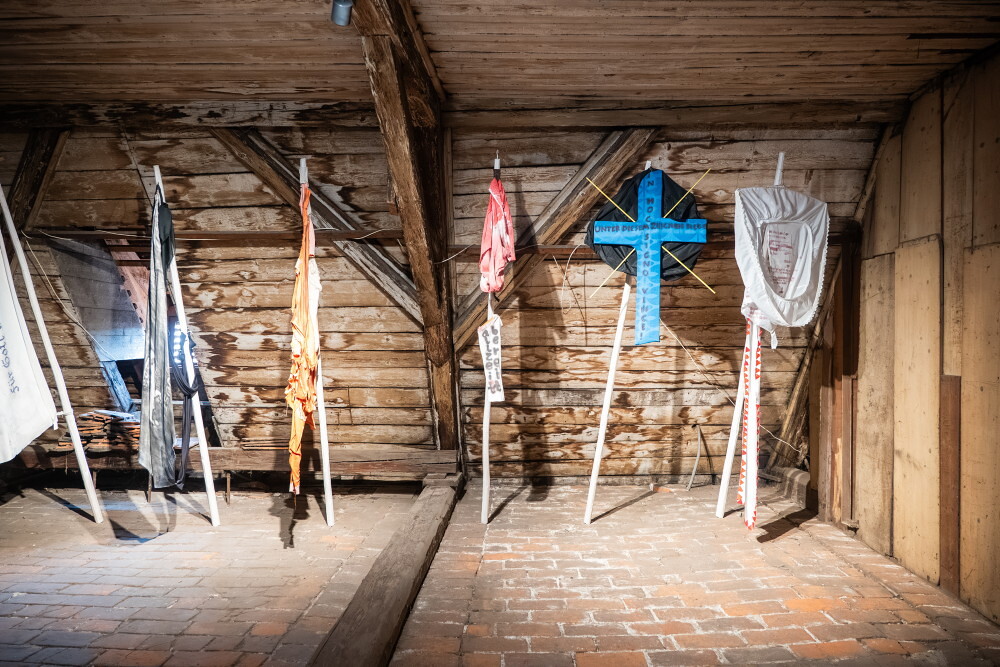 Hannes Priesch, *1954 in Eggersdorf (AT), lebt in Semriach (AT), Fahnen, 2015– Rot-Weiß-Rot,– Fahnenspruch,– Opferseelen,– In diesem Zeichen siege!,– For God and Country / Für Gott und VaterlandHolz, Draht, Stoffe, Wolle, Stickereien, Aquarell