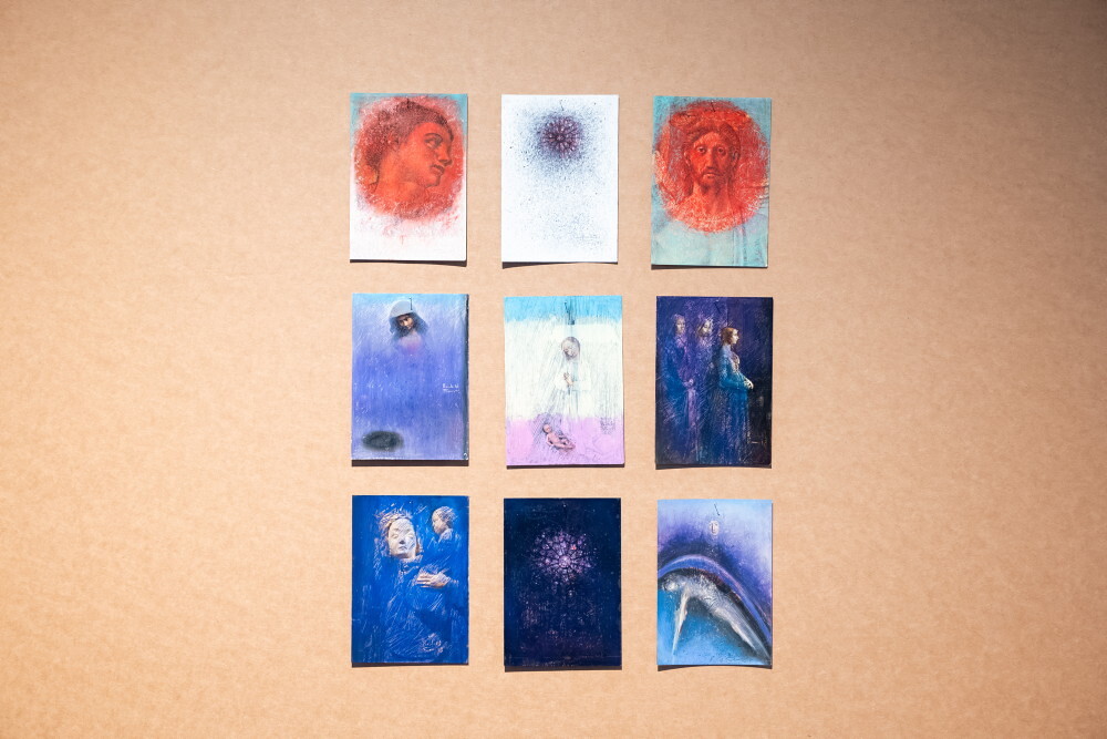 Wilhelm Scheruebl, *1961 in Radstadt (AT), lebt in Radstadt (AT), Allerheiligenserie, 2025_2009/2005, Mischtechnik auf Partezettel (2005–2009), DIN A4, Courtesy des Künstlers
