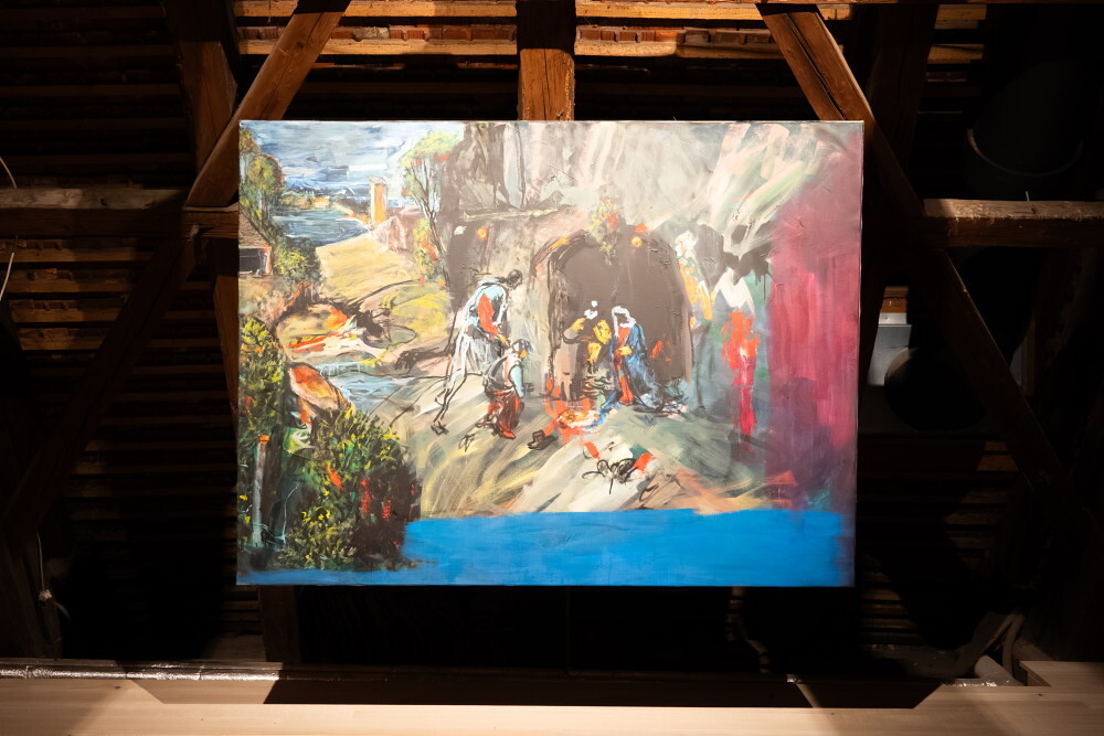 Guillaume Bruère, * 1976 in Châtellerault (FR), lebt in Berlin (DE), 01.12.2020, after Giorgione, The Adoration of the shepherds, painted in Berlin, Acryl und Ölkreide auf Leinwand, 150 x 200 cm, KULTUMUSEUM Graz, aus: Guillaume Bruère: DEAD & AL