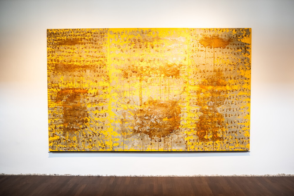 Wilhelm Scherübl, *1961 in Radstadt (AT), lebt in Radstadt (AT), Steinbild (Vera Icon) Tropfen, 1987–89, Triptychon, Leinöl auf Jute, 194 x 316 cm, KULTUMUSEUM Graz, aus: Wilhlelm Scherübl: GEHEN&VERGEHEN (2023), Courtesy des Künstlers