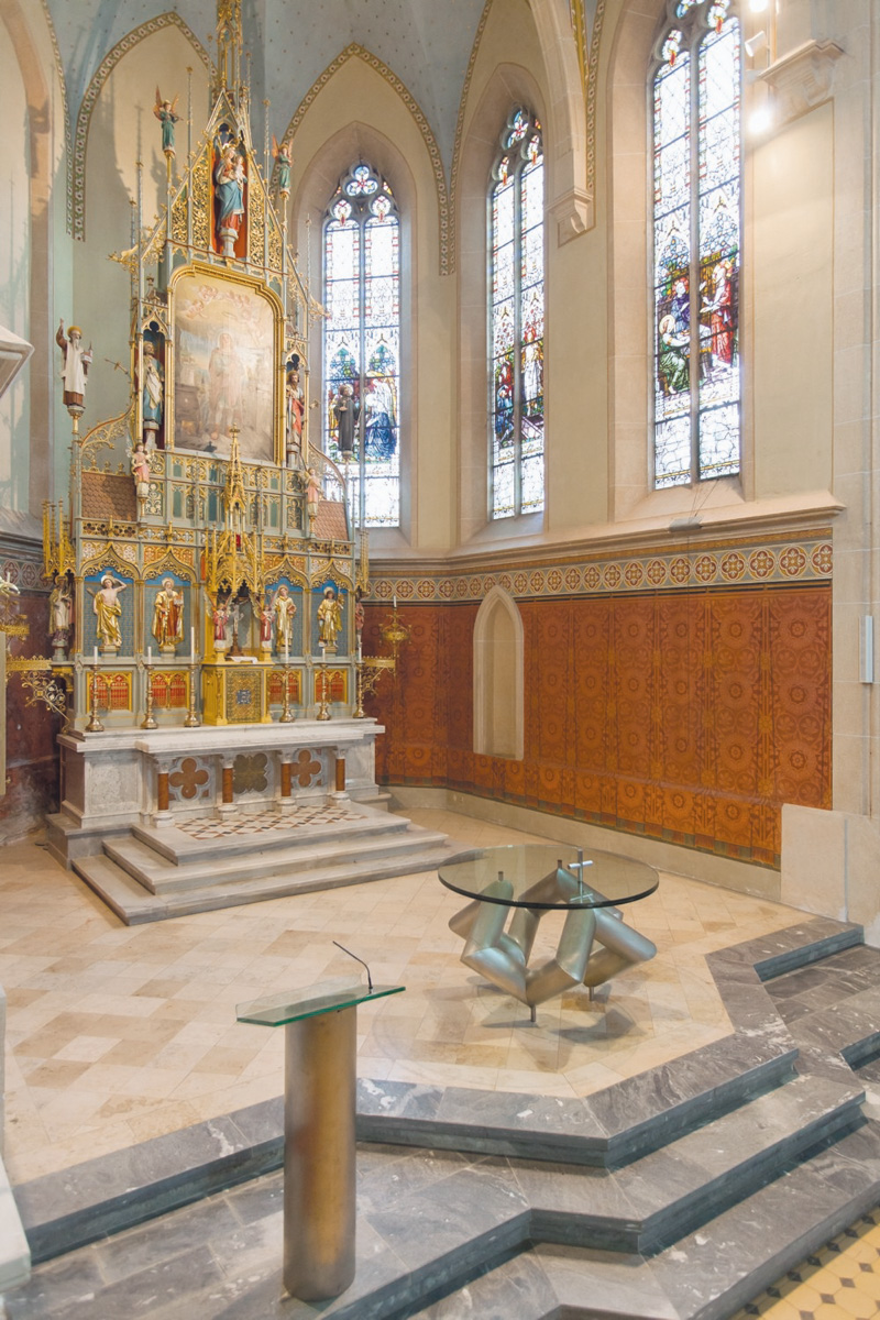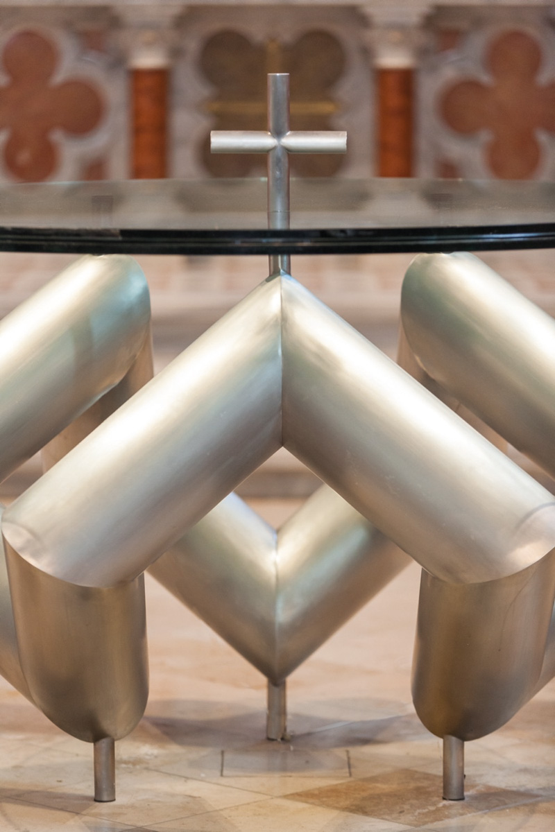 KURT STADLER Altar und Ambo / Altar and ambo, 1995, Stahlrohre, matt geschliffen, Glas / Matte-polished steel tubes, glass Pfarrkirche Hl. Vitus, Weißkirchen | Diözese Graz-Seckau/Nikola Milatovic