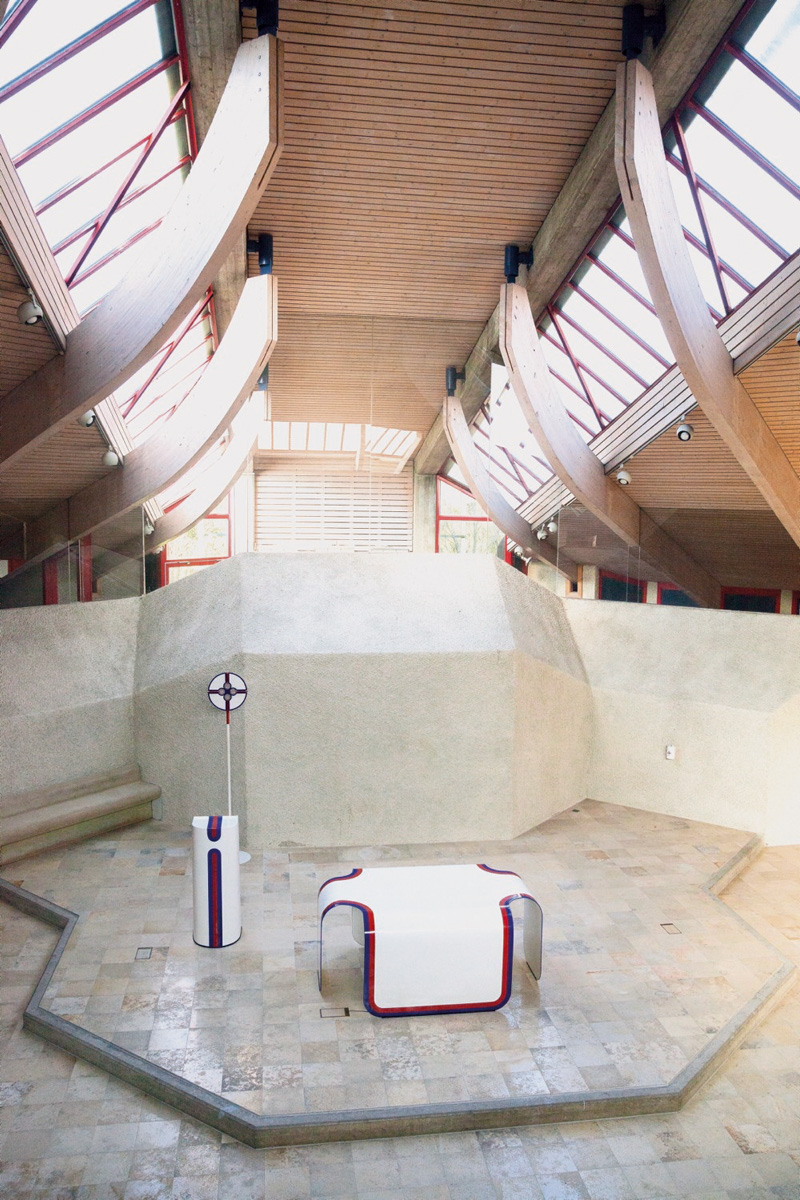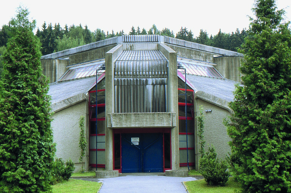 GERHARD LOJEN Altar, Ambo, Vortragekreuz, Kreuzweg / Altar, ambo, procession cross, Way of the Cross, 1974, Metall, lackiert / Coated metal Pfarrkirche Mariä Verkündigung, Graz-Kroisbach | Diözese Graz-Seckau