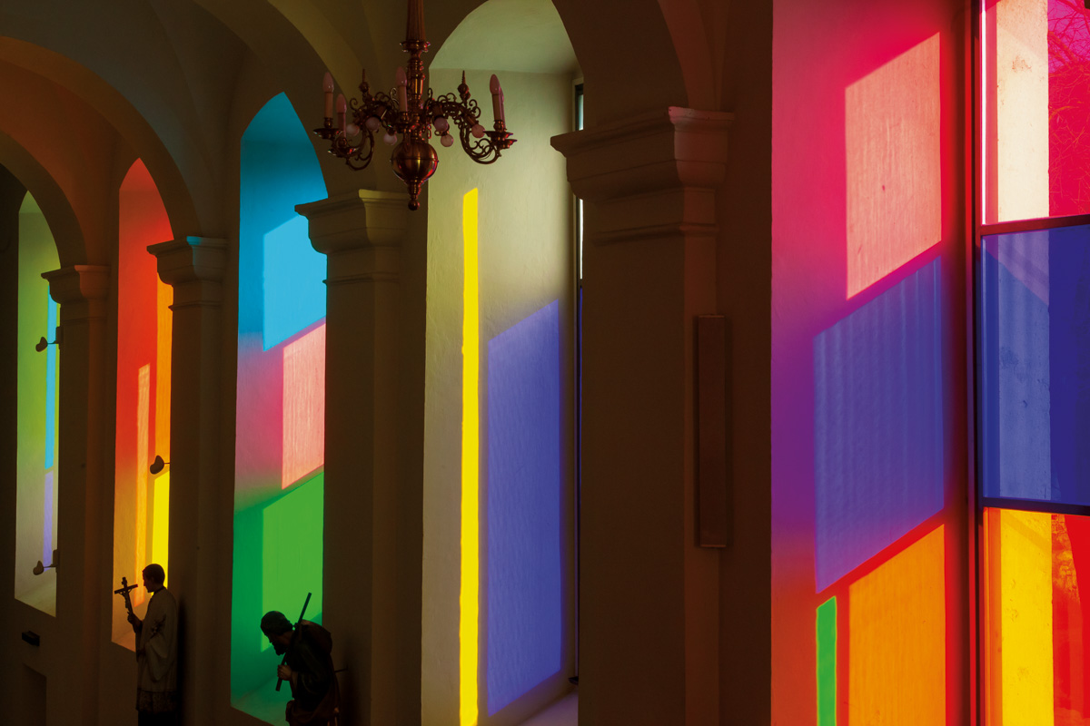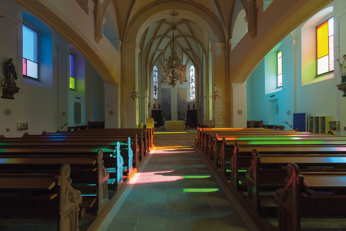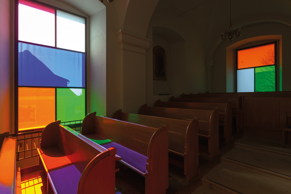 How can one immerse the historical church space in a new light the conditions of the creation of which is linked to contemporary image production? This is the fascinating question for the parish church of Gnas, which has been answered by Flora Neuwirth (*1971). The artist, who comes from West Styria and lives in Vienna, is internationally renowned for mixing high and low culture, and developing new artistic dimensions in this. Her characteristic colours are her trademark. Yet, Neuwirth did without grand gestures in this glass window design. Her colours are simple at first sight but they fundamentally change the historical space in sunlight; they put objects, surfaces, and images into a completely new light of primary colours. From the basically existing division of windows—two vertical glass surfaces and the horizontal surface on top of them—, Neuwirth developed a large number of new divisions which create a new rhythm in their alternation of large and small surfaces in an almost Mondrianesque manner. She allocated one monochromatic colour to each surface. In sum, these are seven shades by means of which she immerses the church space into an alternating light produced by such colours. Digital image production—that is, the one we have become completely familiar with by now—dictates the rhythm here. Neuwirth’s characteristic choice of colours has been taken from the digital basic values of the RGB and the CMYK system, hence the fundamental colour filters without which no images at all would be handed down to us anymore. The RGB colour space (red-green-blue) is additive and corresponds to the light; CMYK (cyan, magenta, yellow, and key), which is used in printing, is a subtractive colour model. Of course, this fundamental reduction is also an iconoclastic reservation against the flood of images we are exposed to—and if it is only the landscape of an east Styrian village that ceased to evade the images beyond its border already a long time ago. Here, artistic and theological intentions meet in an unusually partner-like alliance. Flora Neuwirth has demonstrated in an impressive manner that the debate around high culture or low-threshold access need not only be conducted in the art context but also applies to regions with an unbroken religious practice where the contemporary language of forms is otherwise completely alien: an unusual bridging of worlds far beyond the brand management of big names. The church window project in Gnas was carried out on the occasion of the 15th anniversary of the renovation of the church: One simply wanted to do something for one’s own church, which is visited by about 2,000 people for the celebration of the Holy Mass every week.