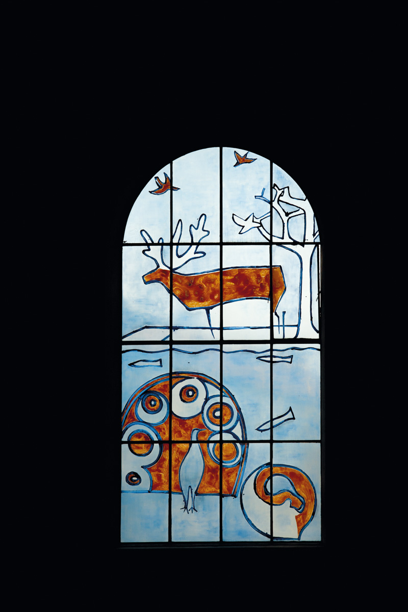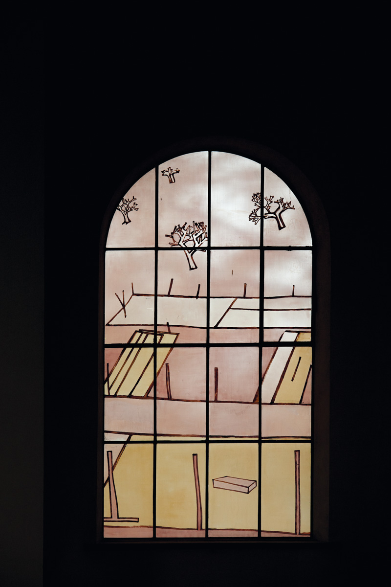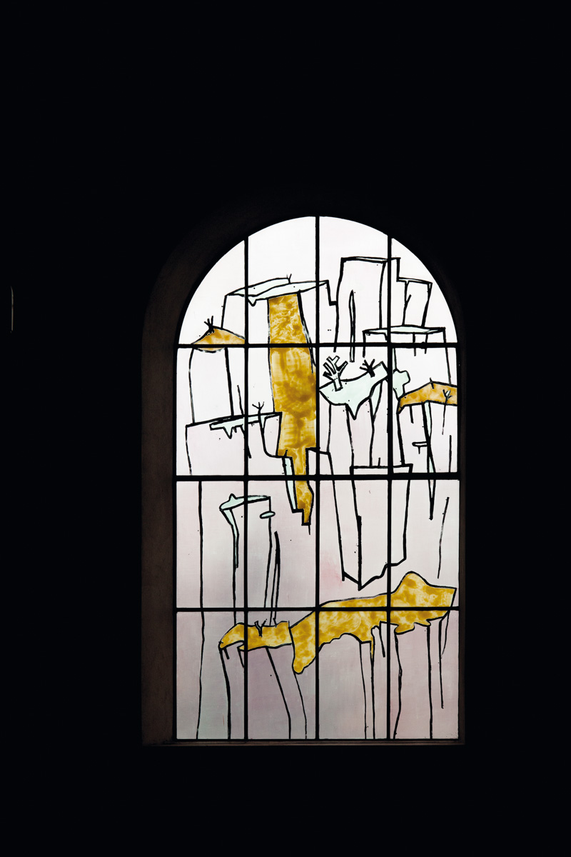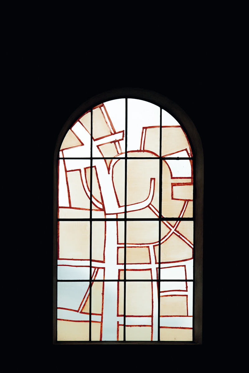 How can the cycles of the history of salvation as they decorated the walls and glass windows of churches over centuries be represented today? How can one show them without working figuratively? Fritz Panzer’s (*1945) glass window designs in the Münzgraben Church in Graz (1997) are an important example for this: They are convincing in their simplicity. They can be read in terms of “ars humilis” (Erich Auerbach), i.e. a “low, down-to-earth, and humble” manner of artistic work, as desired from Christian art time and again. Redirected into a universal symbolic language, cosmic, creation-theological, Christological, sacramental-theological, and eschatological subjects are interpreted in a new manner. The “Window of Obscured Stars” shows black spoked wheels on bright ground—sometimes half the wheel, for the most part the entire wheel. Creation as cosmic drama, the universe, and knowledge of God are touched upon. The “Window of the Rock” is a similar case: The seemingly crystalline lines evade superficial symbolism. The mountain, the rock—a reference to the fact that a mystery remains. The rock is not only used in the Old Testament as a symbol for God. The passing by of the Lord in the shadow of the rock, the Mount Sinai as the place where God manifested himself, the water from the rock that saved Moses are biblical references for a visual representation of the mystery. The cut into a body of water can be found in the “Water Window”. It reminds of early mosaics of baptism in its formal arrangement. The waves appear as plates, open at the top and giving away at the bottom. The “Window of Reconciled Creation” shows living organisms—a stag, a peacock, birds, fishes, a tree, an amniotic sac—on blue ground, their outlines are also blue, and their bodies are painted brown: Archaic animal motifs meet Arcadian gardens, and with them the desire for a peaceful culture and civilisation. The motif of peace among the animals from Isaiah 63 is called up, as well as a simple view on everything living. Associations to the Passion of Christ come up in the following windows but they are not only related to Jesus, and not solely to his suffering: The “Window of the Robe” may remind of the Seamless Robe of Jesus in Trier but it is also armour and protection, and a symbol of dignity as promised by the baptismal rite. The “Window of the Vessels” reminds of the cup that shall be taken away from Jesus but also to any cup of cultic dimensions, or simply of drinking together. Or, they are vases for flowers. Or cups, which only the artist Morandi could paint in a timeless manner. The “Window of the Meal” shows twelve blue place settings on a pink tablecloth from above: a meal without a traitor, if one interprets it in terms of the Last Supper of Christ. But it can also be a simple meal of a larger table fellowship. The “Window of the Garden” does not show any suburban idyll of happy living but rather a garden of toil and exhausting work: Gethsemane, the garden of fear of the suffering of Jesus, seems to be obvious. And, eventually, the window of the “polis”: Life happens in a concrete, and also political, structure. The abstracted city map of Graz refers the history of salvation to a very concrete place. It is happening here and now, in Graz.