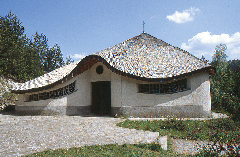 At first sight, one instinctively asks for the meaning of such a markedly modern sanctuary in the midst of remote woodland. Is it only a place of congregation for the Holy Mass? Is it supposed to invite us to stay and contemplate? Do we need this real symbol of a silent presence of God in our nervous time? Do we need this place, which is dedicated to a mystic who brought asceticism and politics into an interesting symbiosis? Complying with what the population had wanted for many years, a place of pastoral care was built in the remote Walster area on the banks of the Hubertus Lake from 1966 to 1967. St. Nicholas of Flüe (1417–1487), who was canonised in 1947, was chosen as the patron saint of the church. The Graz-based architect Eberhard Jäger (1921–2009) was commissioned to build the church. Starting from an at first polygonal sketch—orientated towards the Gottscheer Memorial Chapel in Graz—an organic building structure on a curved, almost elliptical ground plan was built. The rising walls with a curved timber shingle roof which is open to the inside reach their highest altitude above the stone-clad altar wall. Two large-format concrete glass windows reinforce the axial orientation of the space. Like the narrow cross-rectangular and ornamentally designed windows of the Way of the Cross, they were designed by Rudolf Szyszkowitz (1905–1976, an important representative of Styrian modernism. The glass windows in Walster—produced in the glass painting workshop of Schlierbach Abbey— are dedicated to the church patron. The left-hand window shows “Brother Klaus” in the centre, as a standing bearded man in the hair shirt with a rosary. His hermit existence becomes evident in the abstracted nature around him. Mary as the Queen of Heaven and Earth with baby Jesus is floating above it in a medallion. In its style, it reminds of the Statue of Grace in the pilgrimage church of Mariazell. The right-hand window shows crucial situations in the life of the Swiss national saint, who became an apostle of peace and unity for the entire country in his radical succession of Christ. The ploughing angel shows his origin and work as a farmer. His occupations as a soldier, councilman, and judge resonate in the Angel of Justice with sword and balance scales. The floating angel with communion cup and host refers to his strict hermitage. Legend has it that Saint Nicholas of Flüe did not eat anything for twenty years apart from the bread of the Holy Communion. Szyszkowitz presents the saint and the stages in his life with bright and luminous shades, expressive and abstracted forms, which are partly influenced by cubism, and strong contour lines. Thus, he makes the life into one of the most fascinating saints of the early modern period shine. What is also remarkable about this church is the two-winged cast-iron portal. Using a negative technique, Alexander Silveri (1910–1986) expressed four pictorial themes in a visionary manner: the table of the friends of Jesus, the prison of worldly tribulations, Mary with child as the mother of Mariazell with stranded Eve, and the door of grace of Mariazell “as a downward and an upward door” (Silveri).