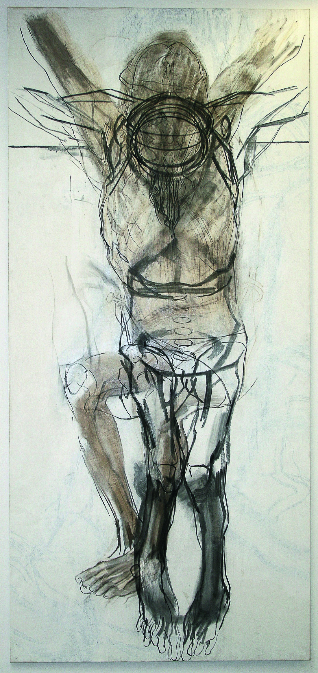 “Father, into your hands I commit my spirit“— this is the sentence from the New Testament (Luke 23:46) on which the planning team of architects, Hofrichter-Ritter and Ritter, based the organic structure of the funeral hall on the Steinfeld Cemetery in Graz, which was completed in 2013. The masonry shells of the building are carefully laid around the windowless space, which is illuminated from above with gently scattered light, like two hands. It was some time after the building’s completion that Franz Yang-Mocˇnik’s image found its place on the front wall of the hall, as it was originally supposed to remain empty. Initially created without being commissioned by the Church, the work nevertheless symbiotically unites with the spatial structure, the entrance of which centrally leads towards the wall, while the side exit directly opens to the cemetery, and defines the space as a sheltering station of pause on a way that leads beyond our existence. An obviously suffering and maltreated figure now bundles the lines of sight in the central axis behind the coffin and the altar. A searching gesture is inherent in the subtle lines, which give proof of the interest in Eastern calligraphy of the artist—as a wanderer between the cultures—, who was born in Völkermarkt in 1951. Several images seem to be laid on top of each other—like sketches for a virtual film. Inspired by scenes from Pier Paolo Pasolini’s epoch-making “The Gospel According to St. Matthew” (“Il Vangelo secondo Matteo”), Franz Yang-Mocˇnik is mainly interested in the human aspect of the Son of God. For him, Jesus Christ is the human being as such. Two figures seem to merge on an already processed ground, but can still be interpreted as independent ones. There is gentle movement in the picture. A face with transfigured eyes can be seen behind a head that is hanging down lifelessly. The distorted motion of the intertwined legs seems to struggle against gravity and the downward pull; the arms of the figure in the background are raised upward—or are they only held up by the nails? Ultimately, the events of Golgotha—death and its possible overcoming—remain an unfathomable mystery. The irreversibility of the limitedness of life on Earth and the question for the reason of suffering and pain are depicted as well as the trace of hope for a possible hereafter, which is given a celestial fundament by the natural light falling in from above. At a place of mourning and farewell where details are perceived more intensely than anywhere else, the artistic design tries not to ignore suffering and pain, or to whitewash it superficially, but to hold the question of life and eternity in the face of death and perishability in suspense, and to open up a future.