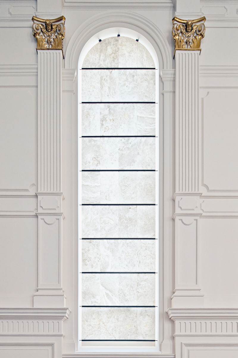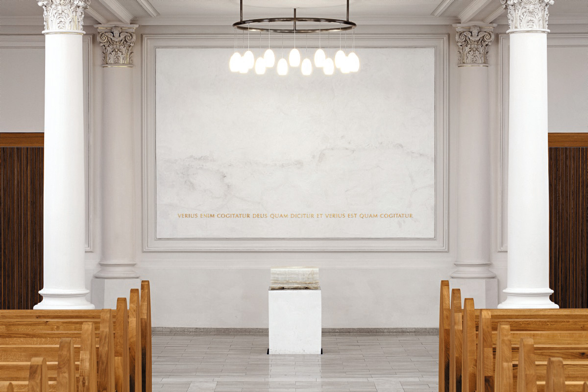 What is sacred in a church can be seen in the recurring materials: rose quartz and green onyx. The baptismal bowl at the entrance, the thick panels of the altar and the ambo, the door of the tabernacle. For the German artist Klaus G. Gaida, it is the synthesis, which, to be sure, did not result from strict liturgical regulations but from the actual narrative 50 years after the reform of the liturgy. What are the essential elements of a Catholic church? Baptism, the word of God, the Holy Communion, permanent presence: four markers of the sacred for a church which, built in neo-Renaissance style in the spirit of historicism, has already been through its sixth redesign. At first, the colourful Nazarene paintings with historicist altar figures created by Jacob Gschiel from the previous church (now a ceremonial hall); radical whitewashing of the walls and the high altar including new seating and sinking a cubistic wreath of lights (architect: Hermann Worschitz); a few years later a neo-Romanesque and cubistic version of the cross and the altar painting created by Franz Weiß; in the mid-1980s, the restorative installation of the former altar figures including a new altar and ambo made of parts of the former high altar; then another change of the altar painting and, after the relaunch of the entire institution as “Augustinum—Episcopal Centre for Education and Vocation, a total redesign again: The uncertainties of the Catholic Church with regard to what is an appropriate space for the celebration of its mysteries can be told all too clearly with this church, which served as a breeding place (seminarium) for the future clergy at least over the entire 20th century. For this reason, the Latin sentence on the entrance wall, in the immediate vicinity of the baptismal font, speaks volumes but, precisely because it is so old, has relieving effects: “VERIUS ENIM COGITATUR DEUS QUAM DICITUR, ET VERIUS QUAM COGITATUR.“ Klaus G. Gaida loves working with books—in which he finds quotes and images. Both became formative for the visual design of this church. The sentence is from Saint Augustine, the patron saint of this institution, and is only 1,600 years old: “GOD IS MORE TRULY UNDERSTOOD THAN HE IS UTTERED AND HIS REALITY IS MORE TRUE THAN OUR THOUGHT.” A powerful caveat against an all too clear conception of how God can be represented even though it has been taken from Saint Augustine’s series of twelve volumes books on Trinity (De Trinitate, Book 7, Chapter 4,7). Yet it is conceivable in the Christian religion, and the wall of images on the front that is diametrically opposed to this sentence makes this—again with quotes from books—visible: The cross in the centre has been taken from one of the oldest representations of the cross in the history of Christianity, in the Syrian Rabbula Gospels (586); Mary to the left and Saint Augustine to the right have been borrowed from the five-volume psalms commentary which was written in the Upper-Austrian monastery of Lambach around 1170. Both miniatures are literally “blown up”, and have been cut out from the newly applied stucco in the sgraffito technique. They visually narrate the basic structure of the church: Mary pointing to the crucified above the ambo on the left altar wall, the crucified in the centre in the robe of the high priest. To his feet, this Eucharistic presence is continued in the tabernacle. The artist placed a brick-built cubic altar into the centre of the presbytery. The Saint Augustine on the right altar wall reads from the open book: The sessio is placed under him; its parabolic shape is in turn taken up in the back rest and in the cheeks of the new pews, which gives the space additional stability. The space is atmospherically enveloped by alabaster walls that are placed as panes in front of the high windows and generate different light moods in the space during the day.