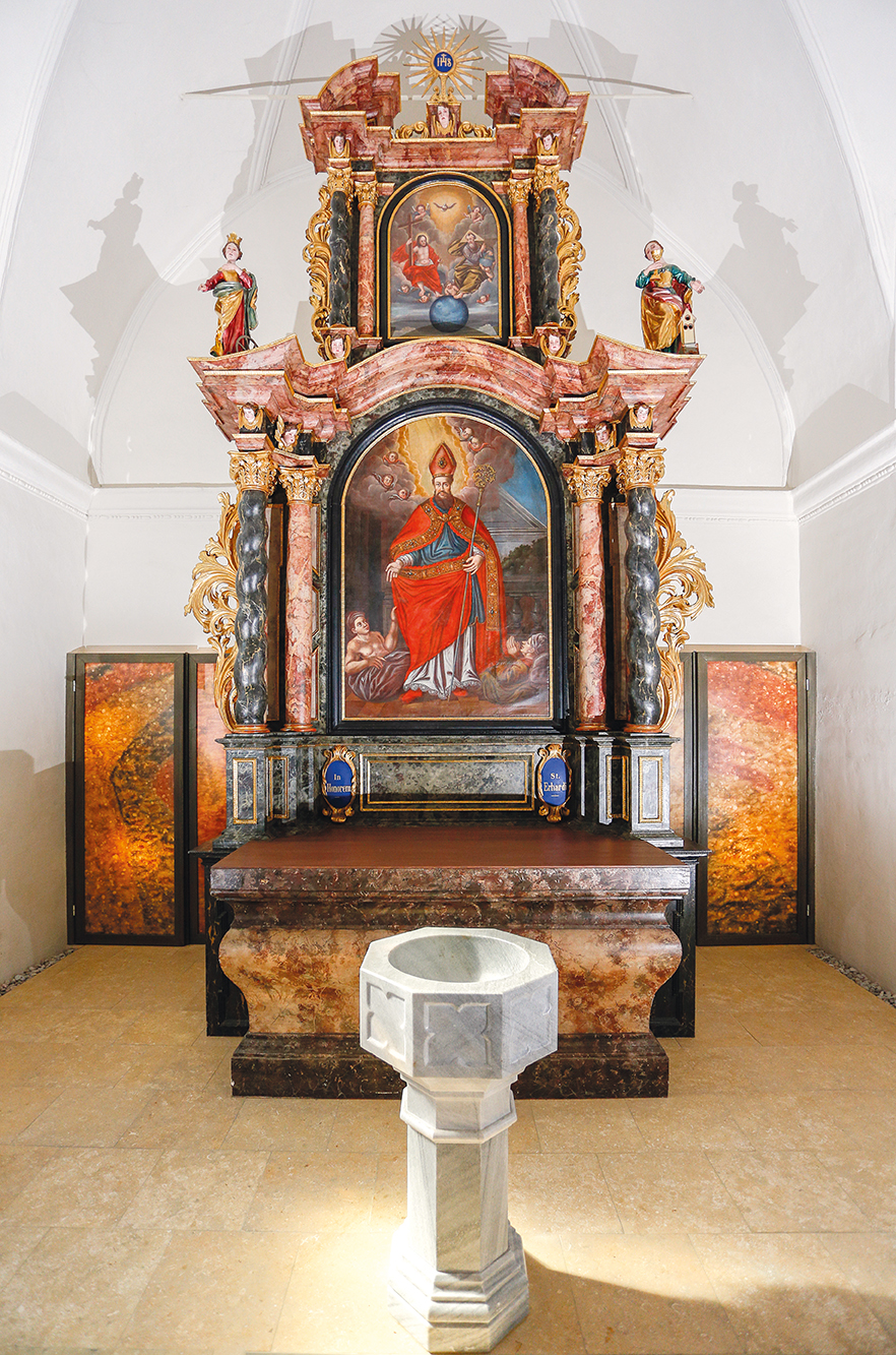 ALFRED GRAF Beichtraum, Taufkapelle, Altarraumgestaltung / Confession room, baptistry, Design of a sanctuary, 2009, Holz, Wachs / wood, wax Pfarrkirche Hl. Oswald, St. Oswald bei Plankenwarth | Diözese Graz-Seckau/Sonntagsblatt, Gerd Neuhold