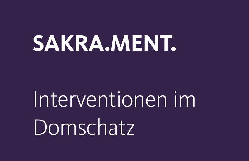 Die sieben Sakramente bilden seit Kurzem den inhaltlichen Leitgedanken zur Aufstellung des Mainzer Domschatzes. Alois Neuhold lässt mit seiner farbsatten Intervention bunter Becher, Schalen und Gefäße an das Himmlische Hochzeitsmahl denken. Die Gefäße sind unbenützbar, leer. Im Ensemble sind es trotzende Öffnungen für das Nichtgreifbare, Platzhalter für das erahnbar Heilige und Hoffnung für ein Getränk unstillbaren Genusses. Nina Kovacheva hingegen zeigt am Ende des Raumes ein Kind, wie es mit seinen leblosen Spielpuppen das Abendmahl spielt. Vor historischen liturgischen Handschriften des Domschatzes präsentiert Alois Neuhold seine „Messplatten der geheimen Offenbarung des Johannes Offenberg“ aus, die die Apokalypse zwar erahnen, aber nicht öffnen lassen. Gerhard Lojen stellt mit seiner Bucharbeit eine Verbindung zu den alten Handschriften her, aber auch an die Macht und Geheimniskraft von Büchern, denen deshalb mitunter auch Gewalt angetan wurde.