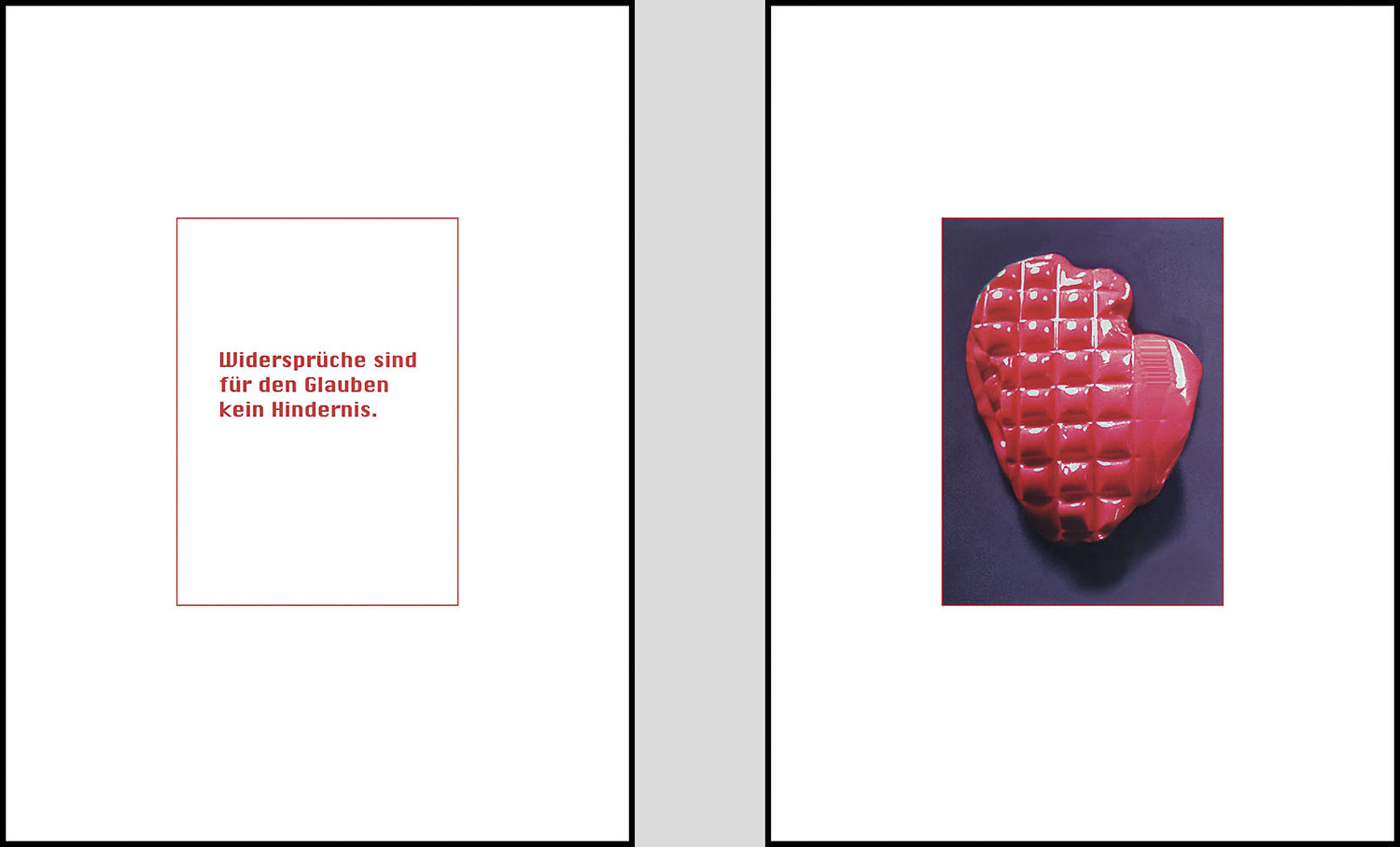 Die ersten beiden Museumsräume handeln von der Fragilität der Wahrheit und der Suche nach spezifisch christlichen Codierungen. Vorangestellt ist das Foyer, das die beiden berühmtesten Museen für Gegenwartskunst als verschlossene Reliquiare (Zlatko Kopljar) zeigt und mit den Bildern von Anna und Bernhard Blume die Raumstruktur dieses Museums in Form von Sätzen ersichtlich macht: ernst und gebrochen, mit Witz und Abgrund gleichermaßen.
