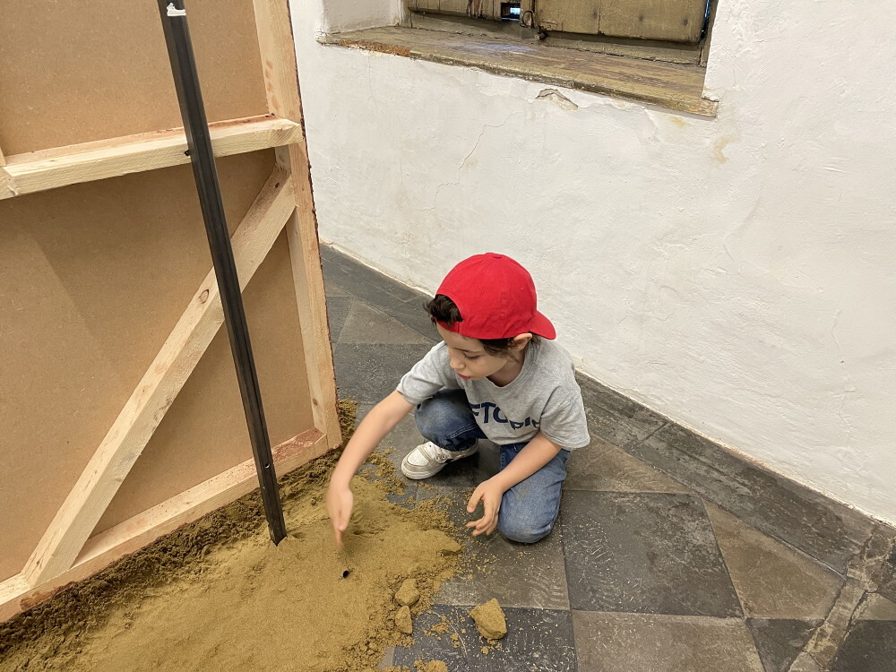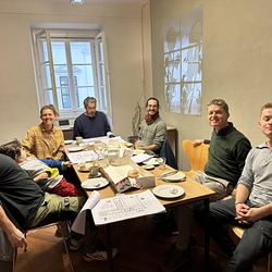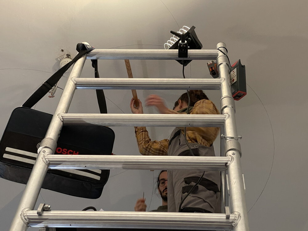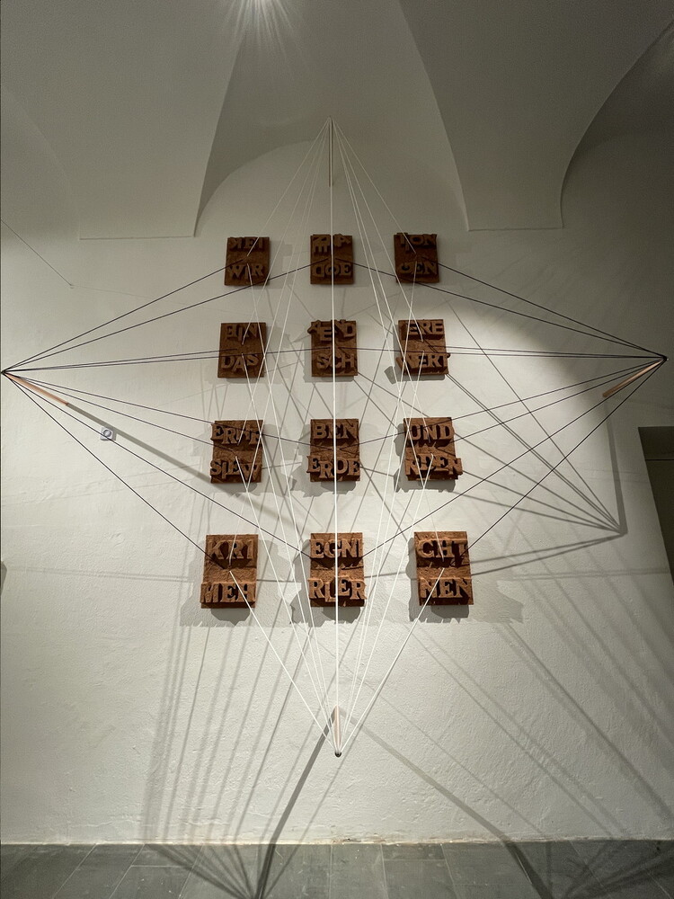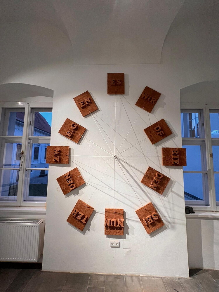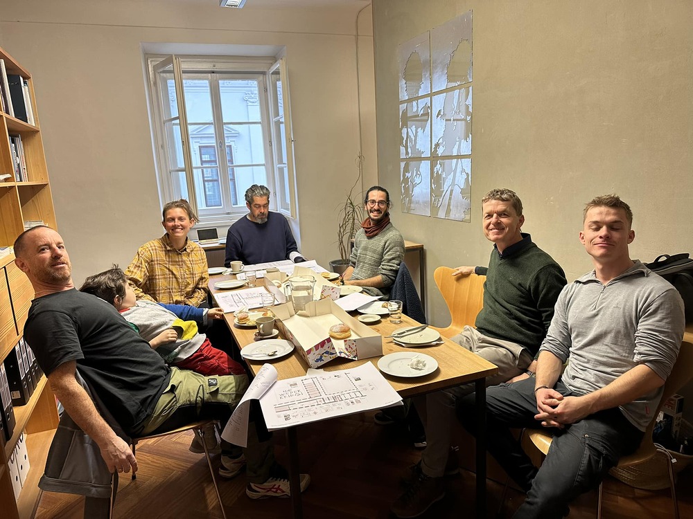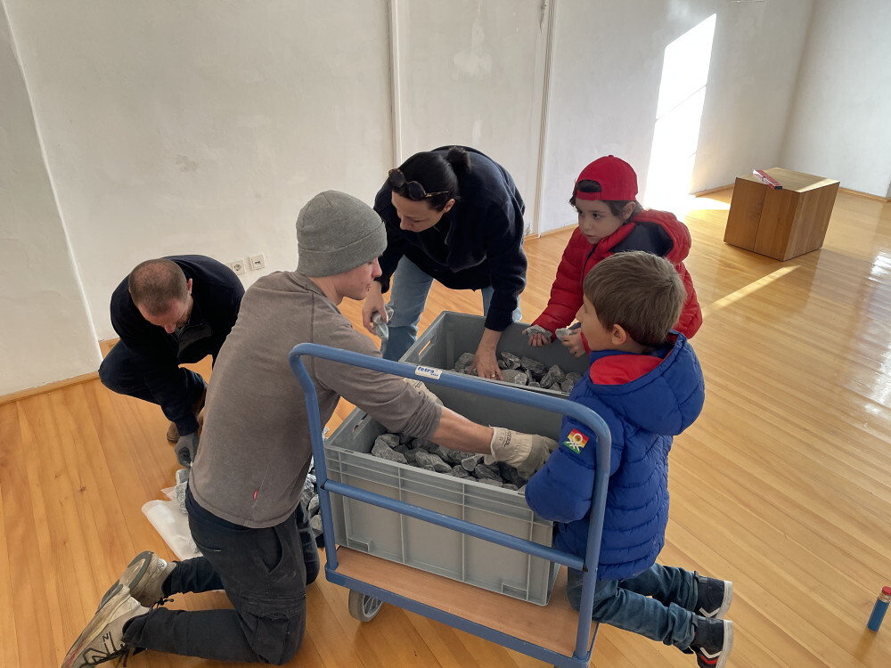 Ein großartiges Aufbauteam: Zenita Komad, Amir Katz, Basilis Neururer, Nora Samset, Florian Altenburg und David Rauchenberger bauten die äußerst umfangreiche Ausstellung "NIE WIEDER KRIEG" in wenigen Tagen im Jänner 2024 im KULTUM auf.