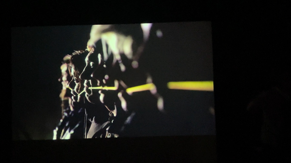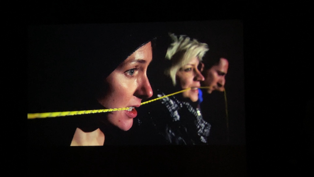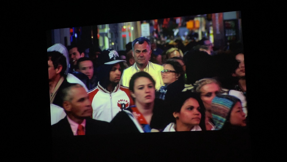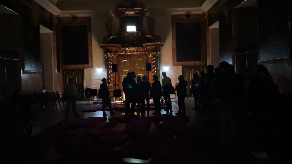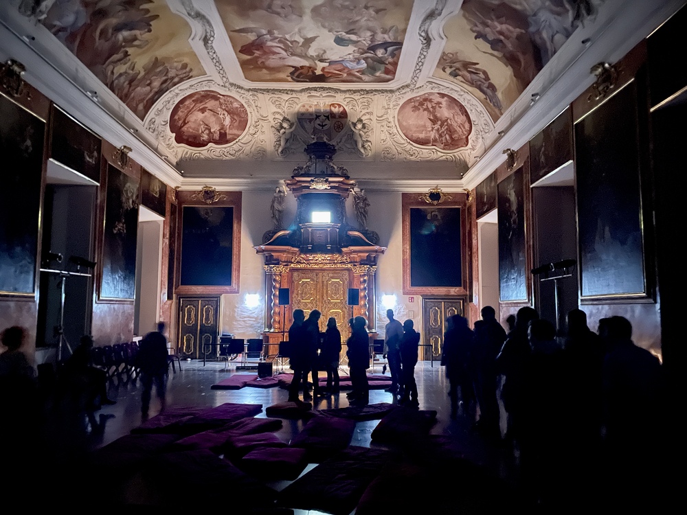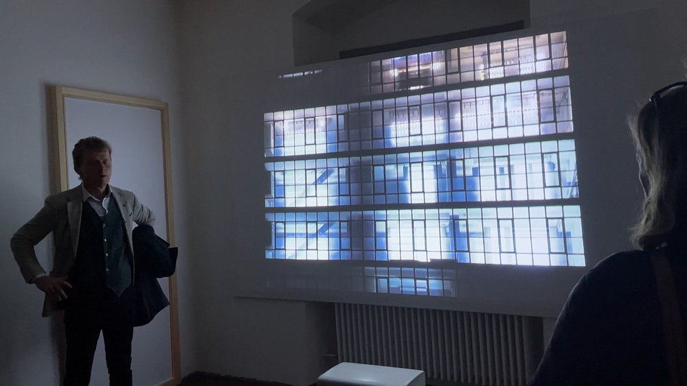 Ein Hochhaus voller Lichter im 2. Stock zieht eine Lichtfigur an... Eine pathetische Stimme ruft im Minoritensaal zum letzten Zusammenhalt auf. Am Gang vor dem Minoritensaal kniet ein Mann kniet vor der Wallstreet in New York. Ganz in der Nähe sind große Gemälde, die Erhabenheit ausstrahlen. Im Dachboden hat sich ein Meer aus Federn breit gemacht - darauf liegt eine zwei Meter schwere Nadel. Und schließlich stehen wir vor Architekturmodellen des MoMA in New York und der Tate Modern – einmal als Betonskulptur und ein anderes Mal in Form eines Reliquiars.