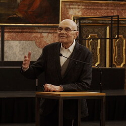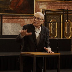 Zur Eröffnung hat Johannes Rauchenberger den bekannten Vermittler von Kunst und Kirche auf internationalem Niveau, em. Univ. Prof. Friedhelm Mennekes SJ gebeten: Er hielt die Eröffnungsansprache, die die Zuhörenden im Minoritensaal bis auf den letzten Platz in den Bann gezogen hat: "Ich weiß, wo ich bin und ich weiß, wo ich heute bin", begann der wortgewaltige Jesuit seine Ausführungen. Er würdigte Fink als einen Mann mit ungeheurem Tiefsinn in Sprache und Bild. Von "zwei Großen" sprach Mennekes in der Folge und meinte damit Otto Mauer und Josef Fink: "Sie lagen sich zwar nicht in den Armen, aber der eine nahm vom andern Notiz."