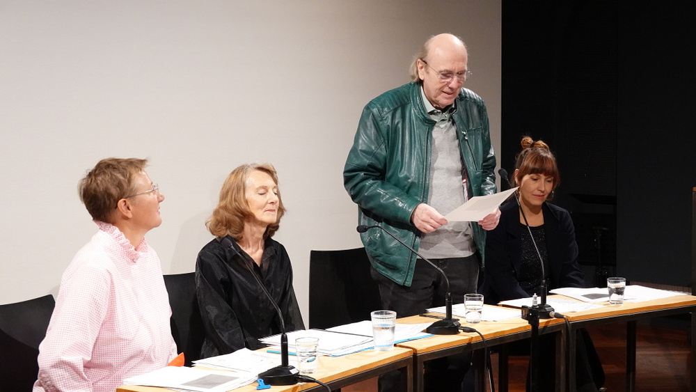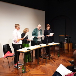 In aller Kürze ein paar biographische Eckdaten aller beteiligten Künstler: Die Vokalistin und Improvisatorin Lauren Newton arbeitete bereits in den 1980er Jahren eng mit Ernst Jandl zusammen. „Vom Vom zum Zum“ (1986) begegneten sich Jandls Sprachakrobatik und Newtons vokale Grenzgänge unmittelbar. Ihre Stimme ist Instrument, Text und Resonanzraum zugleich, eine Brücke zwischen Literatur und Musik. L.N. lebt in Tübingen. Ruth Johanna Benrath lebt in Berlin; sie schreibt Lyrik, Prosa und Hörspiele. Mit dem lautpoetischen Hörspiel „Geh Dicht Dichtig!“ (u.a. mit Elfriede Gerstl und mit Musik von Lauren Newton) wurde sie 2019 mit dem Titel Hörspiel des Jahres ausgezeichnet. Ihre Arbeit bewegt sich im Spannungsfeld von Text, Klang und Performance. Herbert J. Wimmer, der in Wien lebende Autor, gilt als eine der zentralen Stimmen der experimentellen Literatur Österreichs. Seine Texte reichen von Gedichten über Romane bis hin zu Hörspielen und Klanginstallationen. In Zusammenarbeit mit Künstlerinnen wie Marion Steinfellner entwickelt er interdisziplinäre Performances, die Text, Bewegung und Medienkunst verbinden. Judtih Nika Pfeifer, die derzeit in Brüssel lebt, arbeitet zwischen Poesie, Prosa, Performance und transmedialen Projekten, bricht Konventionen, spielt mit Tippfehlern, verschobenen Syntaxen, Visualität und Klang. Ihre Texte wurden in zahlreiche Sprachen übersetzt, sie regelmäßig zu Gast auf internationalen Festivals, zuletzt Transpoesie 2025 in Antwerpen.