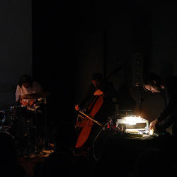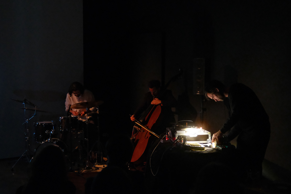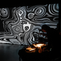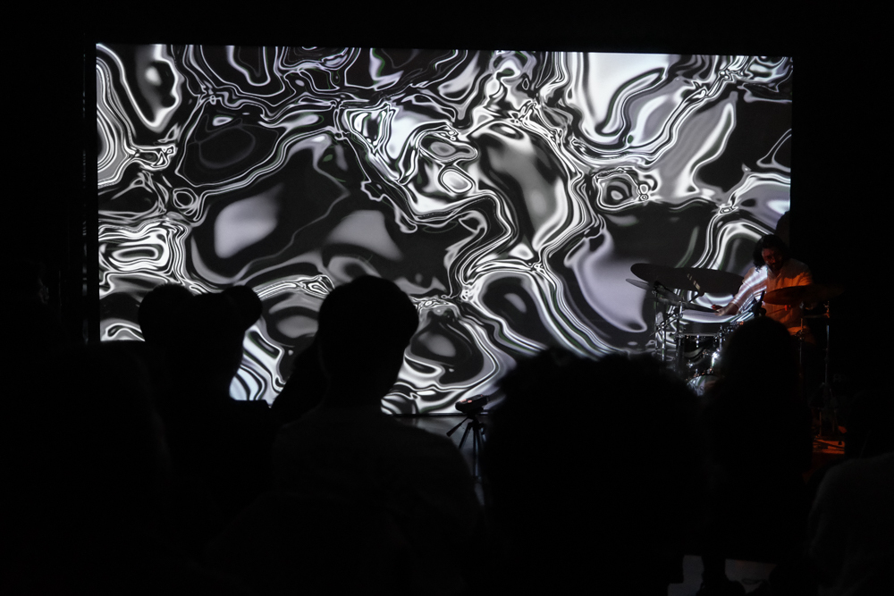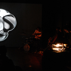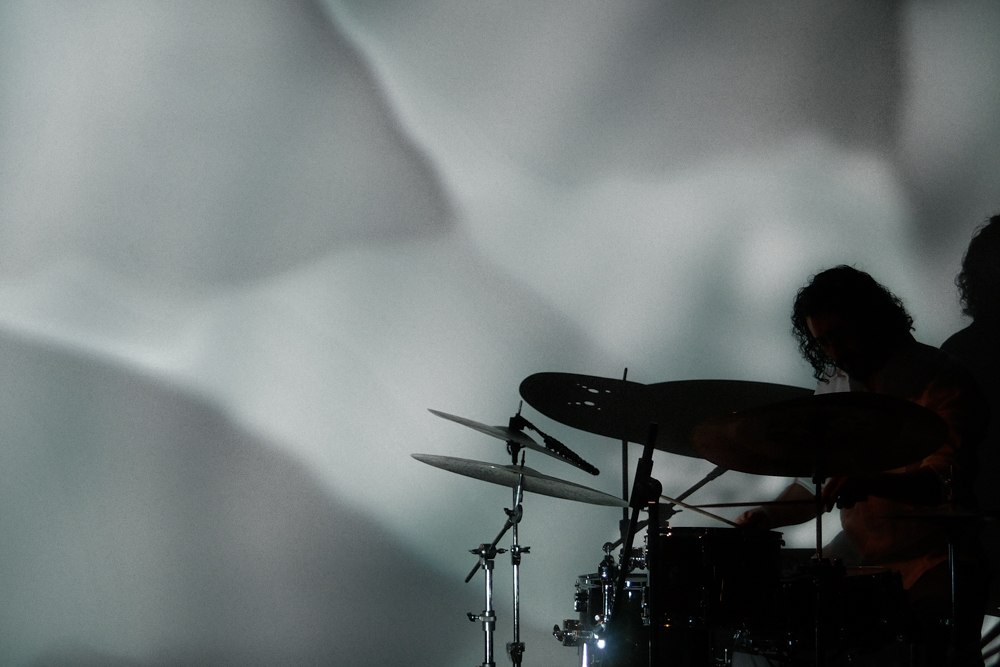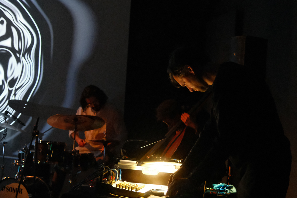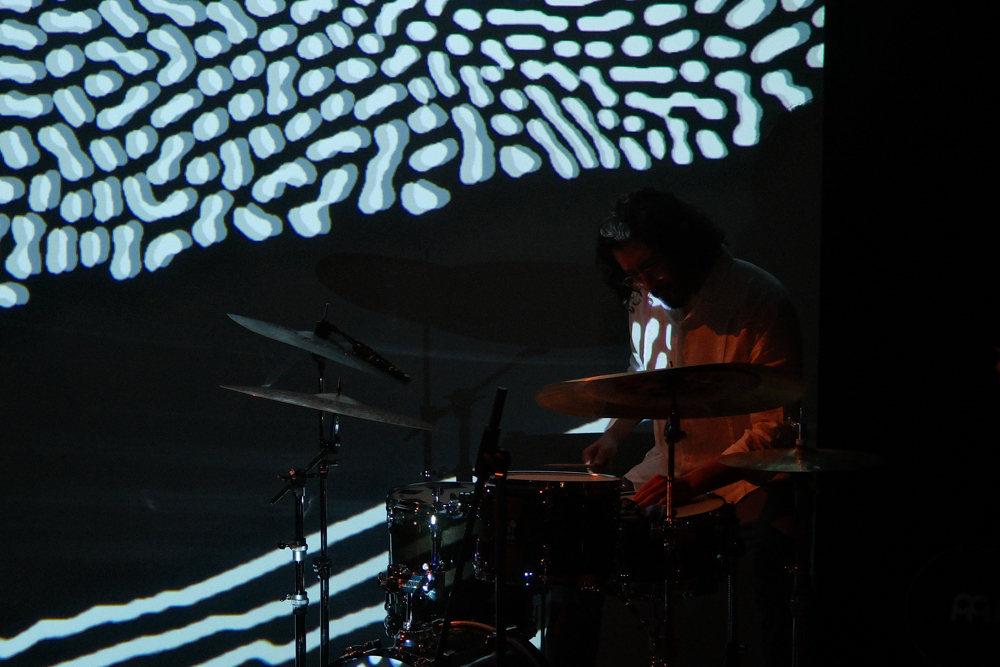Elektronik, Schlagzeug und Bass. Dazu kommen in Echtzeit gesteuerte visuelle Projektionen.