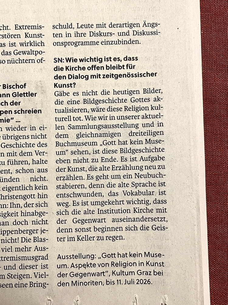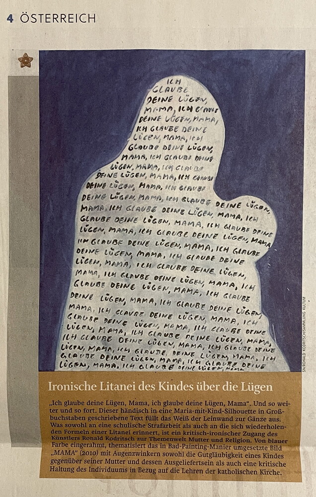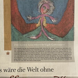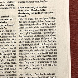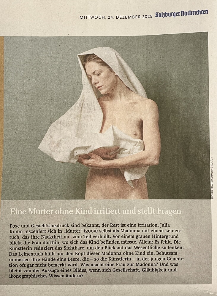 Zum Interview von Martin Behr mit Johannes Rauchenberger: „Ist Religion in der Kunst der Gegenwart noch ein Thema? Die SN nehmen das Weihnachtsfest zum Anlass, um abseits tradierter, idyllisch-idealisierter Bilder mit Krippe und Heiligenschein nach zeitgenos-sischen Interpretationen des Motivs Maria mit dem Jesuskind Ausschau zu halten. Und wurden fündig in der Sammlung des Kultum, diesem vom Theologen und Kunsthistoriker Johannes Rauchenberger