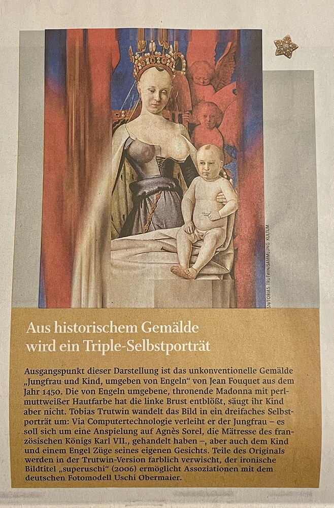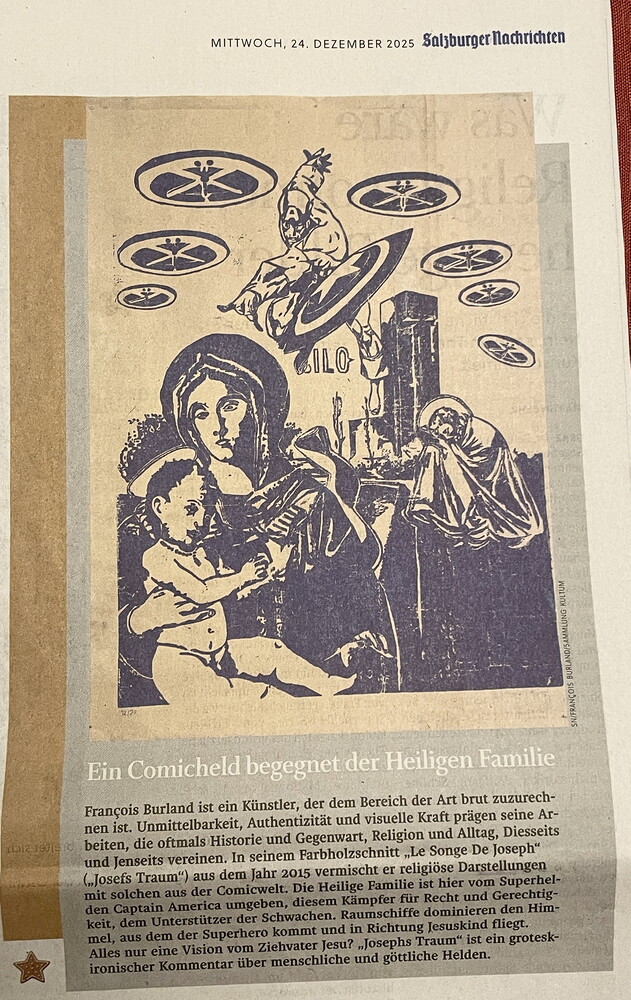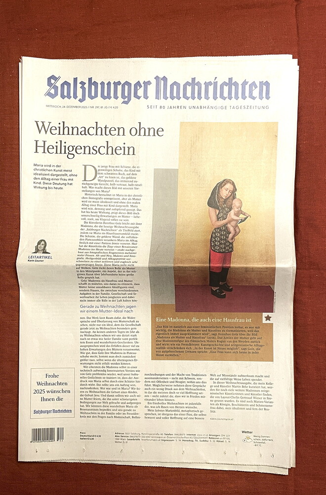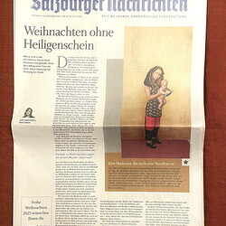 Die ganze Weihnachtsausgabe der "Salzburger Nachrichten" wurde mit Madonnen-Bildern aus unserer Sammlung des KULTUMUSEUM bestückt, die die Chefredakteurin Karin Zauner, die Artdirektorin Gertraud Wieser und der Journalist und Künstler Martin Behr ausgewählt haben. Es ist unglaublich schön geworden. Die Texte zu den insgesamt 18 Bildern (!) verfasste Martin Behr.