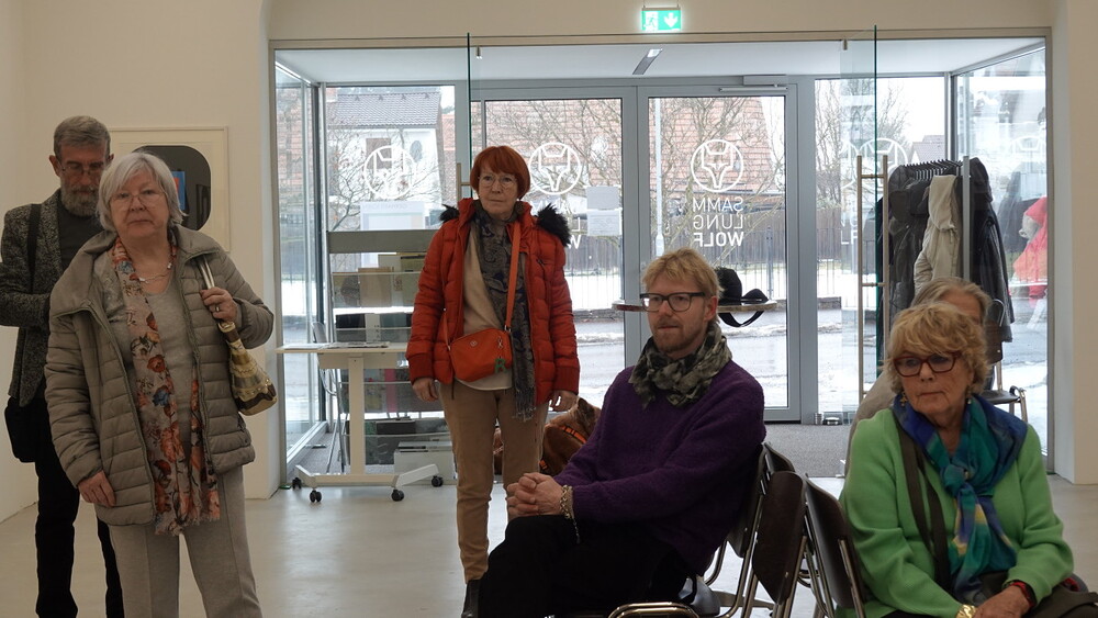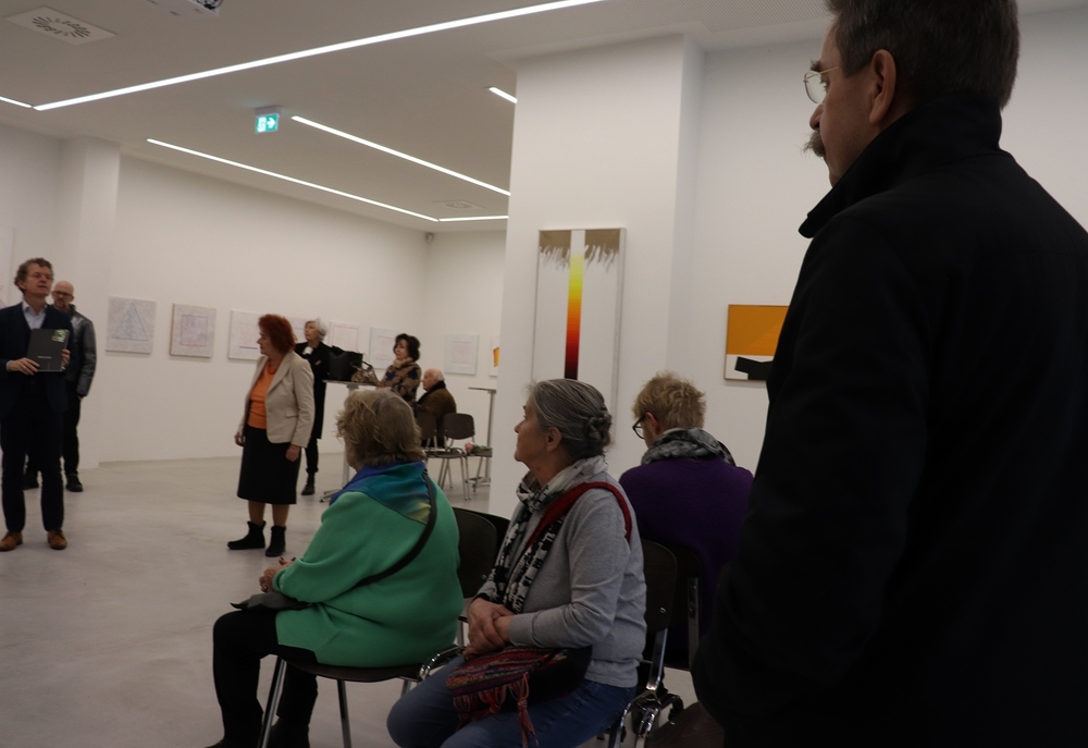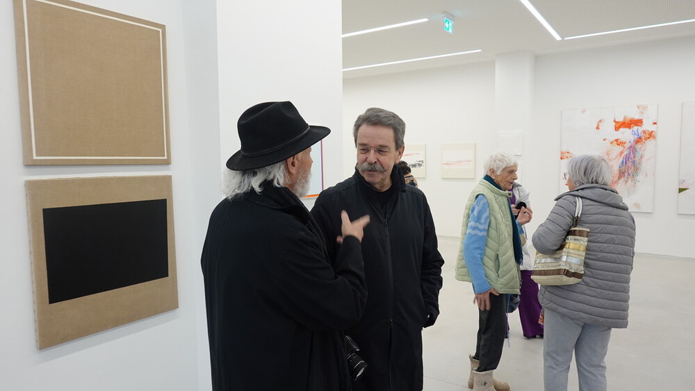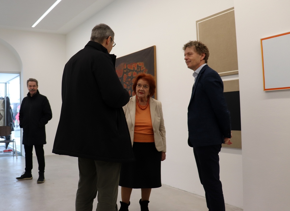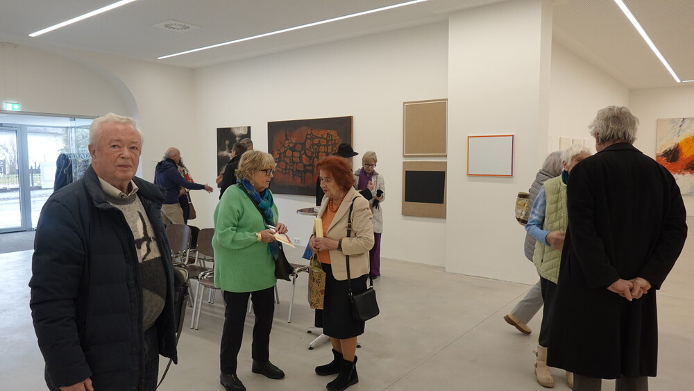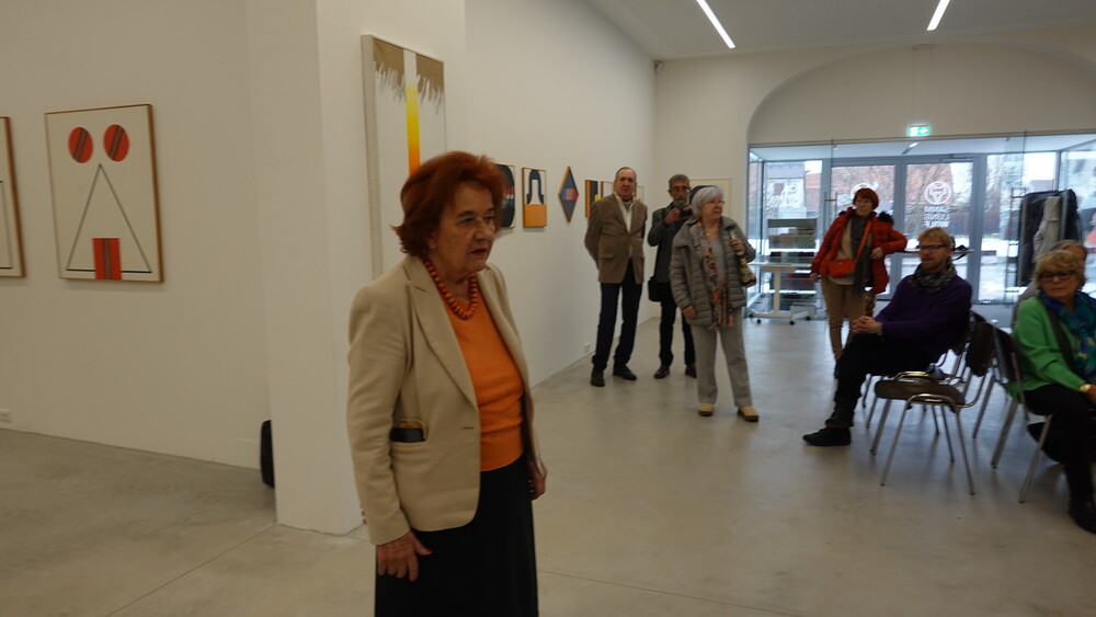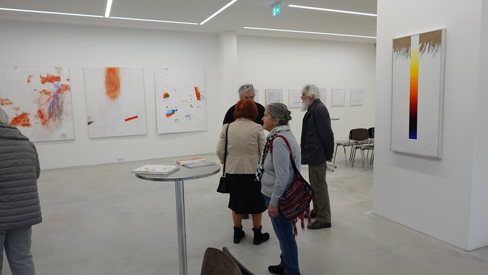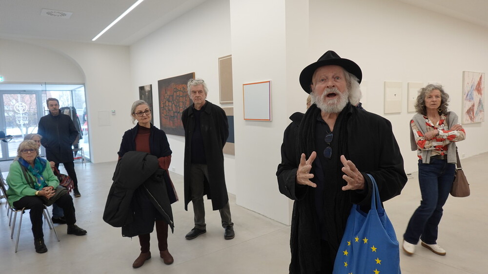 Abschlussführung im Spiegelgitterhaus Gleisdorf bei der so schönen Schau der Bilder von Gerhard Lojen, angefangen von den frühen Bildern der Materialabstraktion der frühen 1960er Jahre, über die Aneignung der konstruktivistischen Abstraktionen, vorbei an den "Randzonenbilder" der 1970 er Jahre und den roten, farbenfrohen "Vogelbildern" der späten 1980er bis hin zur totalen Abstraktion im Weiß in den letzten fünf Jahren seines Lebens, die nach der Krebsdiagnose entstanden waren - insgesamt 400 an der Zahl...