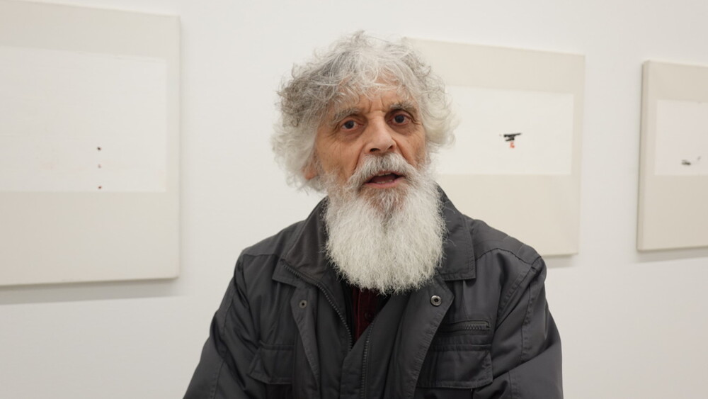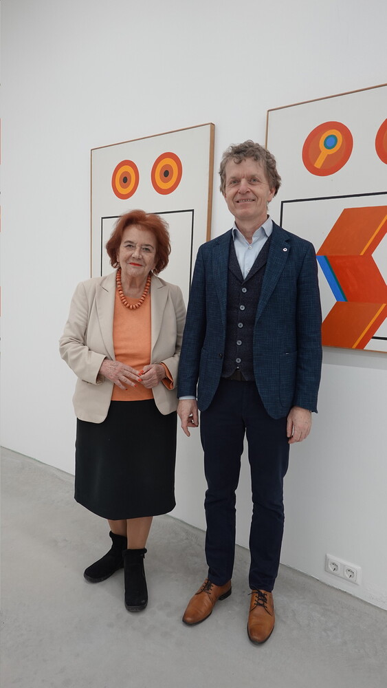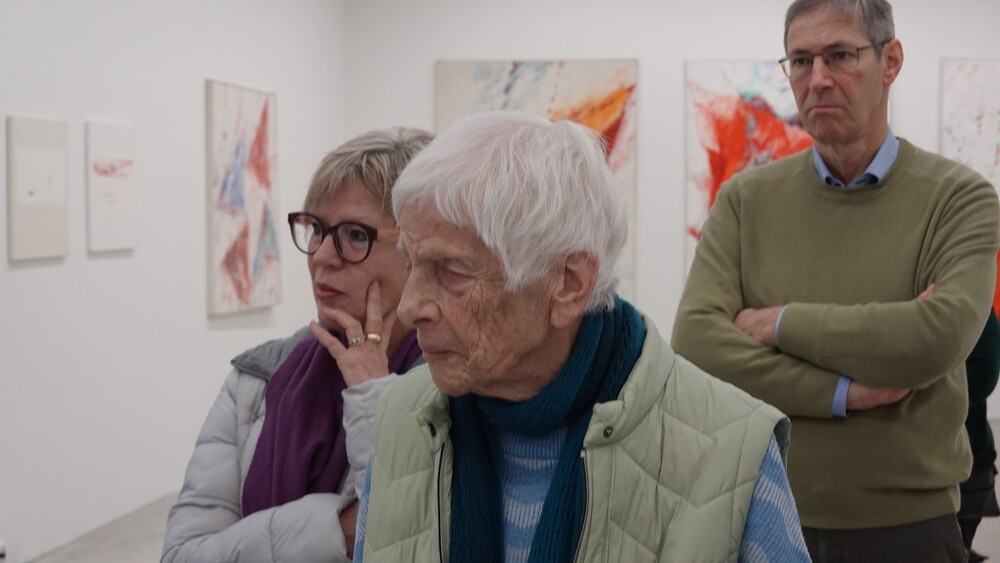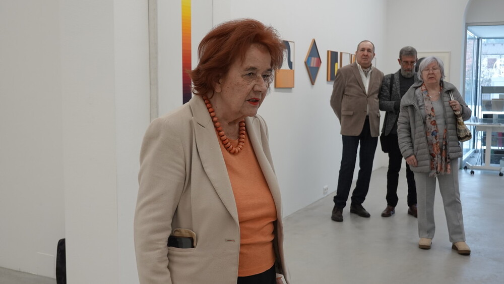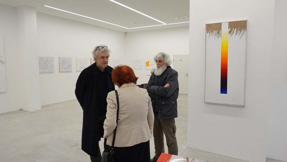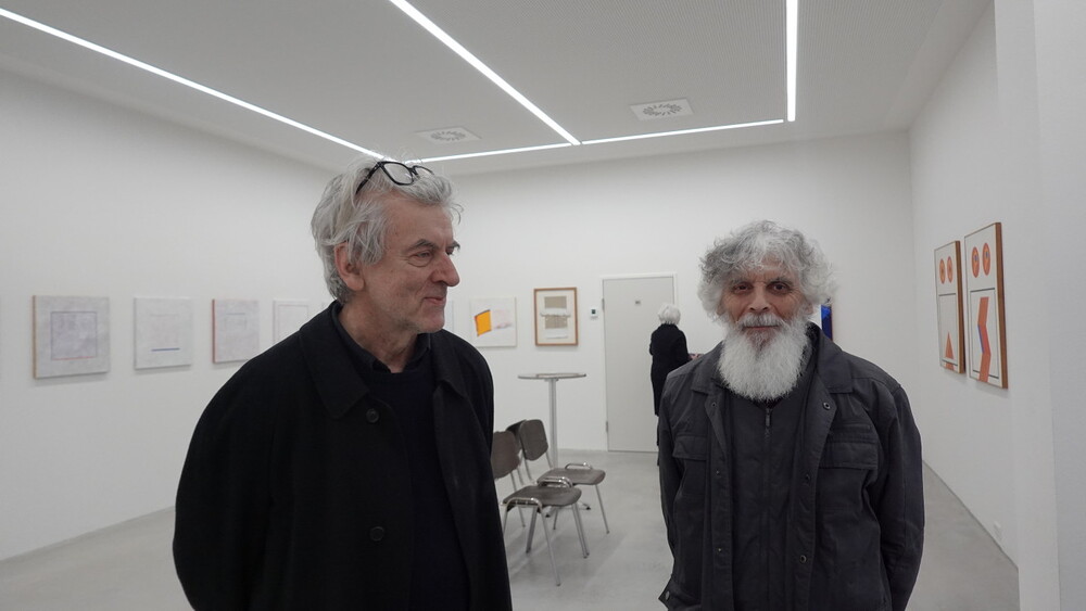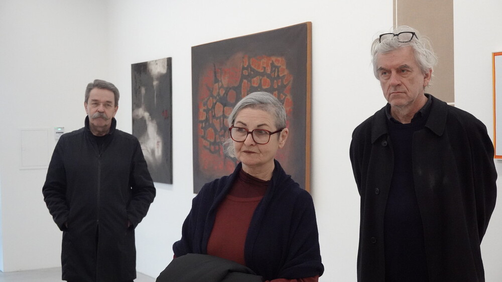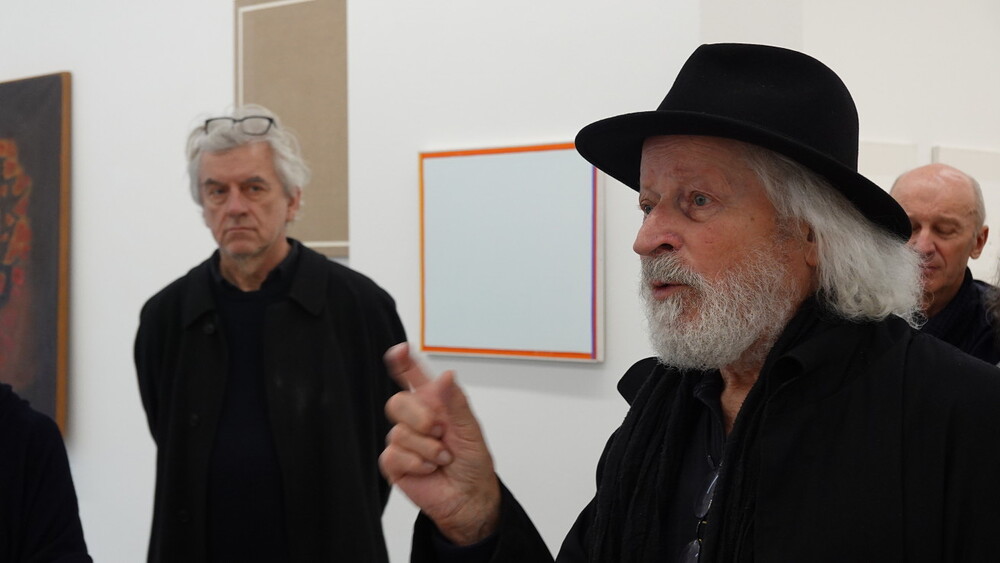 Abschlussführung im Spiegelgitterhaus Gleisdorf bei der so schönen Schau der Bilder von Gerhard Lojen, angefangen von den frühen Bildern der Materialabstraktion der frühen 1960er Jahre, über die Aneignung der konstruktivistischen Abstraktionen, vorbei an den "Randzonenbilder" der 1970 er Jahre und den roten, farbenfrohen "Vogelbildern" der späten 1980er bis hin zur totalen Abstraktion im Weiß in den letzten fünf Jahren seines Lebens, die nach der Krebsdiagnose entstanden waren - insgesamt 400 an der Zahl...