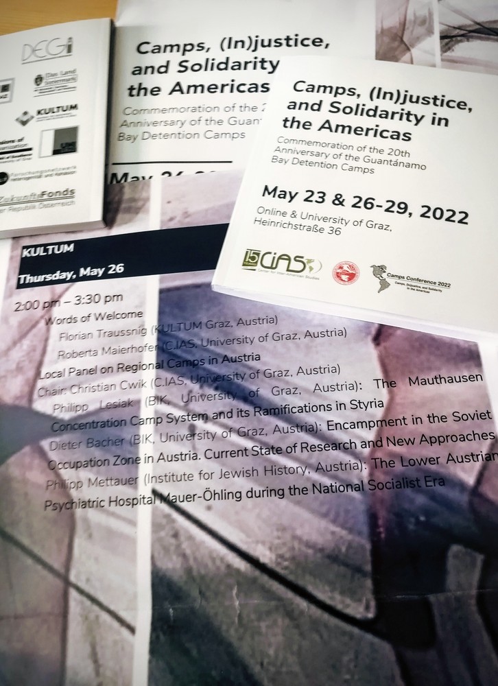 Drei ehemalige Gefangene des menschenrechtswidrigen „Terroristen“-Lagers der Bush-Regierung in Guantánamo - Lakhdar Boumediene, Ahmed Errachidi und Mohamedou Houbeini - waren im Cubus anwesend, als KULTUM-Diskurskurator und Gastgeber Florian Traussnig gemeinsam mit Prof. Roberta Maierhofer vom Center for Inter-American Studies (C.IAS) an der Uni Graz die internationale Konferenz Camps, (In)justice, and Solidarity in the Americaseröffnete.