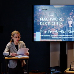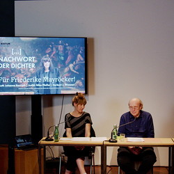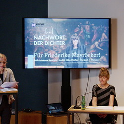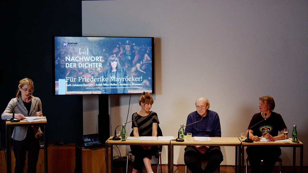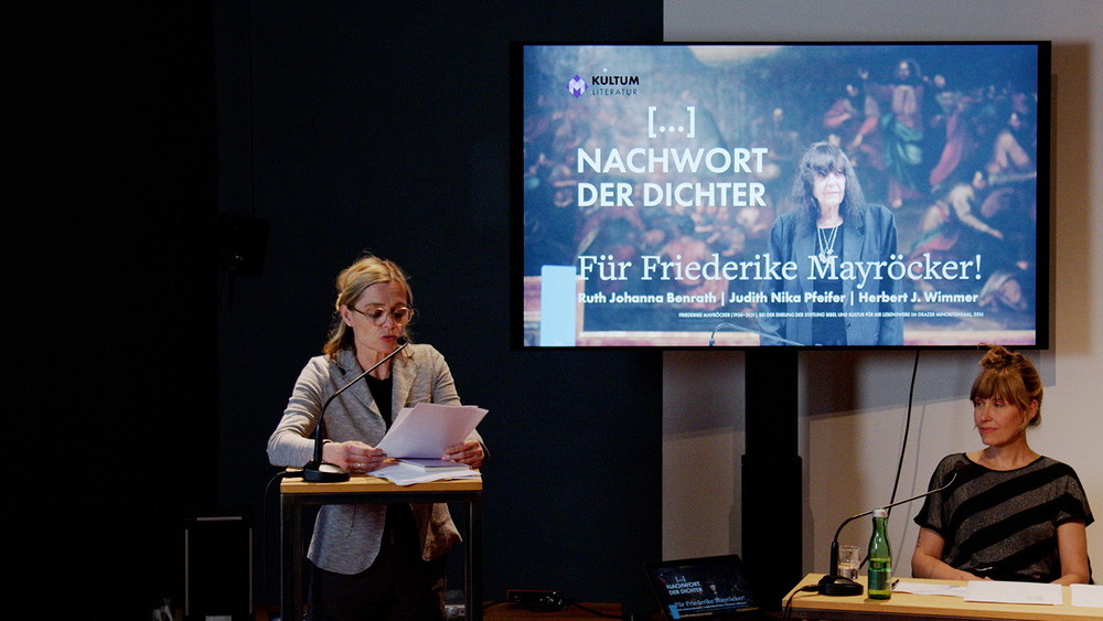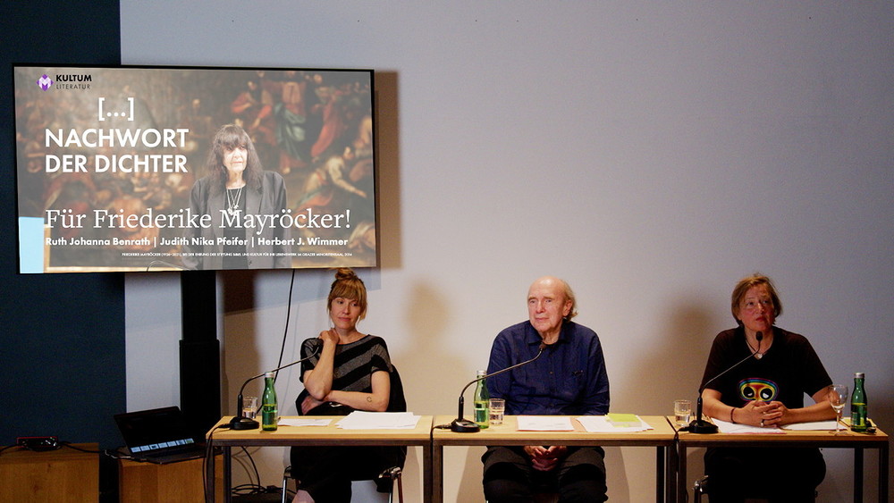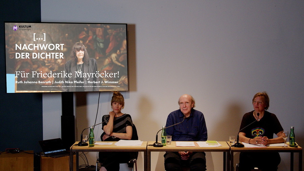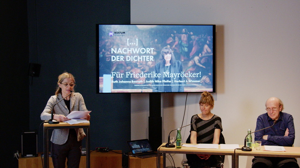 Ruth J. Benrath, Judith N. Pfeifer und Herbert J. Wimmer eröffnete am 23. Mai 2022 im KULTUM in Graz die Reihe „Nachwort der Dichter“. Es wurde ein Abend, der, wie Literatur-Kuratorin Barbara Rauchenberger bei der Einführung sagte, "Friederike Mayröcker umarmen wird: literarisch wie auch persönlich! Denn diese Reihe ist als 'Gedenkabend' gedacht, als 'Abenddialog', als Nachwort auf Dichter und Dichterinnen, die für das eigene literarische Schaffen von Bedeutung waren oder immer noch sind. ... Der erste dieser Reihe wird ein Abend für Friederike Mayröcker (es könnte durchaus auch heißen ein Schriftstellerleben für FM!) diese „WELTLITERATIN“, die am 4. Juni letzten Jahres verstarb." Den vielleicht schönsten Nachruf hat FM selbst verfasst: „Mein Leben war zu kurz für meinen Lebenstraum“, so schrieb sie es in ihrem Buch „Scardanelli“. „Ich lebe ich schreibe“, das war für eine der wohl bedeutendsten österreichischen Schriftstellerinnen ein einziger Atemzug, ein einziger Schriftzug. Beim Dichten „auf der Honigspur“ kannte ihre poetische Welt keine Grenzen. Sie hat aus ihrer Welt herausgeschrieben, sich unentwegt verblüht, sich Wort wörtlich verzettelt, sanftmütig und magisch zugleich. So hat Friederike Mayröcker auch das Schreiben von Ruth Johanna Benrath, Judith Nika Pfeifer und Herbert J. Wimmer geprägt. Sie schreiben, schreiben weiter und tragen so ihr Erbe in ihren Texten in die Gegenwart, indem die Formprinzipien ihres Schreibens – Witz, Poesie und Sprachspiel – weitergesponnen werden. Der Abend war eine große, äußerst gelungene Verbeugung vor Friederike Mayröcker – ein Text-Pingpong, welches das sprachspielerische, dialogische Element ihres Schreibens weiterdachte, verfremdete und „spiegelte“. Drei Musikstücke, die FM "besonders mochte" (H.J.Wimmer) strukturieren die Leseperfomance.