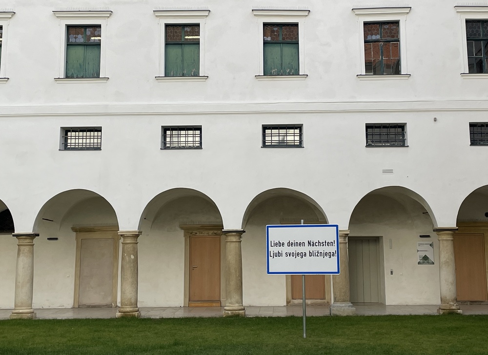 Die Grazer Ausstellung, die vor allem aus ganz neuen Werken besteht, widmet sich angesichts der derzeitigen Weltlage dem umfassenden Thema des Friedens. Der messianische Frieden, wie ihn der Prophet Jesaja in der Bibel formuliert hat, findet in Bildwerken ebenso seine poetische Bildkraft, wie eine Ahnengalerie aus Frauen und Männern der Weltgeschichte von Bertha von Suttner bis Gandhi, die Komad mit den Besuchenden wörtlich in einem „Friedensbüro“ vernetzt. Objektbilder und Grafiken mit starken Text-Bildkontrasten vollenden die Schau.
