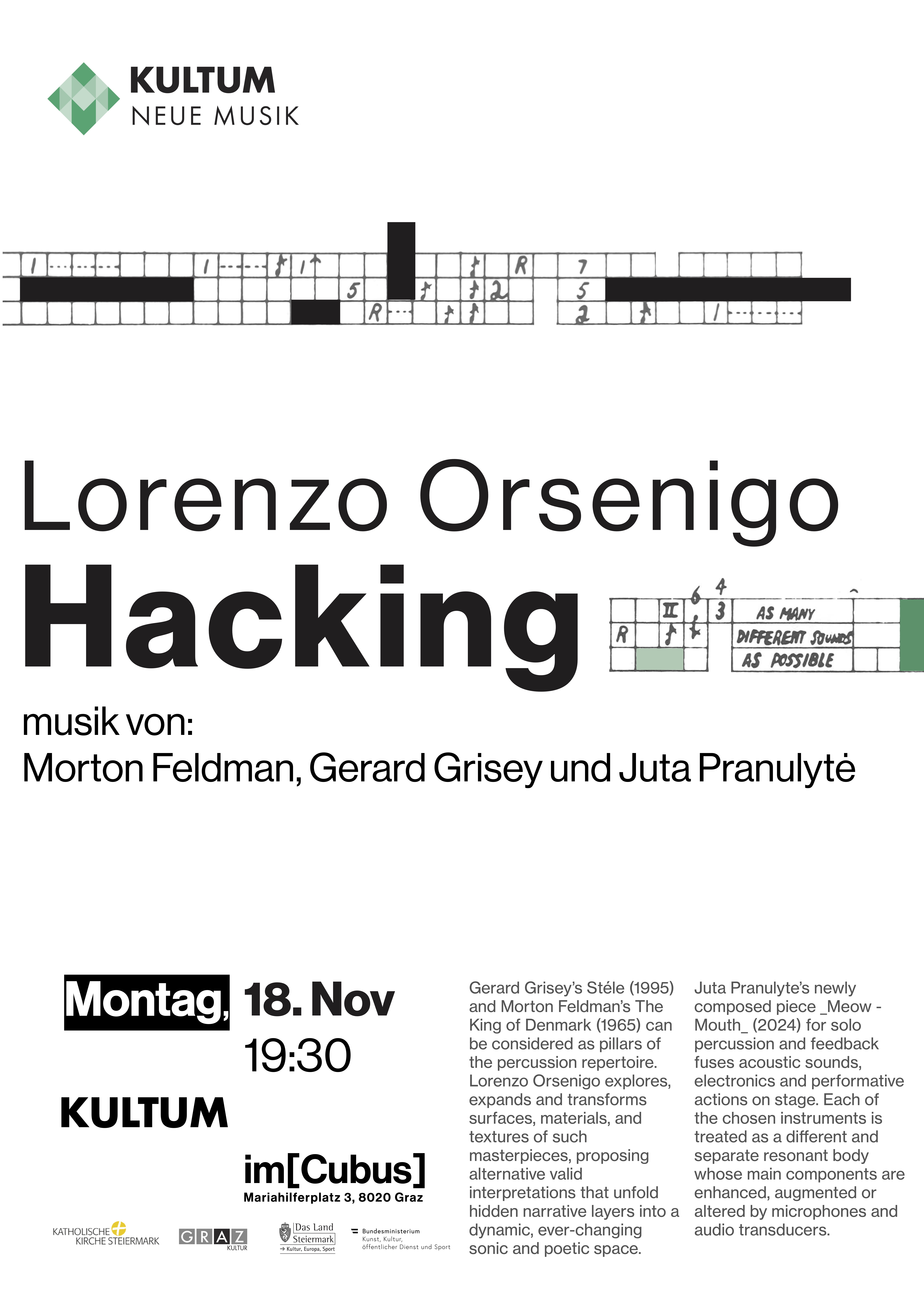 Gerard Griseys Stéle (1995) und Morton Feldmans The King of Denmark (1965) können als Schlüsselwerke des Schlagzeugrepertoires betrachtet werden. Lorenzo Orsenigo erforscht, erweitert und transformiert Oberflächen, Materialien und Texturen dieser Meisterwerke und schlägt alternative, gültige Interpretationen vor, die verborgene narrative Schichten in einem dynamischen, sich ständig verändernden klanglichen und poetischen Raum entfalten.