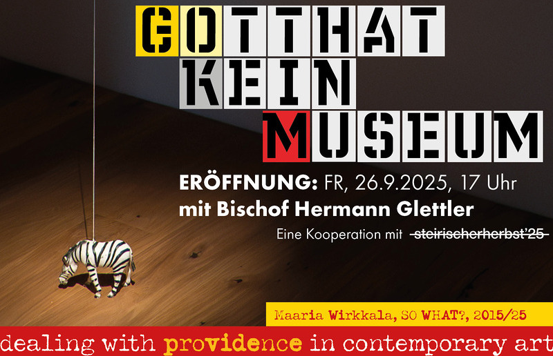 How does religion actually appear in contemporary art? For 25 years, this question has been a leitmotif of Johannes Rauchenberger in the search for contemporary art at KULTUM. Over the last 15 years, hundreds of exhibitions have resulted in a collection that is unique in Europe in terms of the intensity of this question. In steirischer herbst 25, this will be shown for the first time in the newly adapted KULTUM—as an ‘anniversary exhibition’ to mark its 50th birthday. In nine sections, the exhibition explores a desideratum in current museum operations that can neither be fulfilled nor claimed per se: a museum for God. His codes, his ‘iconography’, the contradictions in his images, the (super)faith of his witnesses, the plight of current fundamentalism, the dream of uniting knowledge and faith and the poetics of coming to terms with ‘ultimate things’ unfold in a wide variety of works on four floors. The attic of the old monastery is also included. More >>
