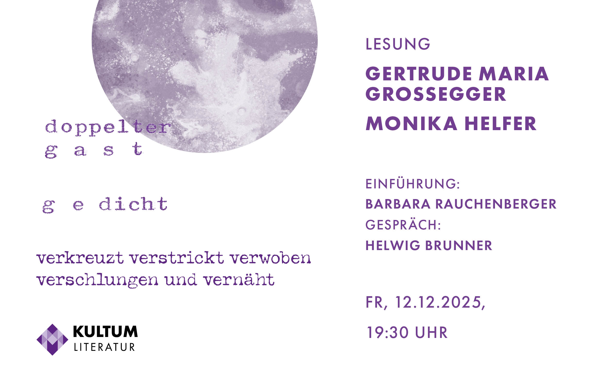 Es lesen Gertrude Maria Grossegger (unveröffentlichte Gedichte) und Monika Helfer (aus ihrem ersten Gedichtband Bitte schick mir eine Droge, Hanser, 2025)