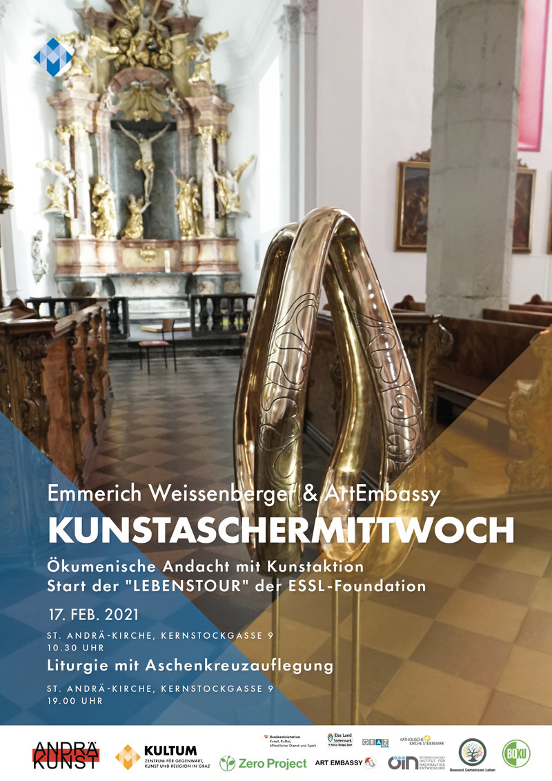 Der Kunst-Aschermittwoch 2021 von Graz-St. Andrä in Kooperaton mit dem KULTUM setzt bewusst Signale der Hoffnung. Die Corona-Pandemie positiv nutzen, ist erklärtes Ziel aller, die an der Aktion und ökumenischen Feier teilnehmen. Brücken bilden und Hoffnung geben wollen Pfarrer Alois Kölbl und sein evangelischer Kollege Matthias Weigold. Das Kollektiv ArtEmbassy von Emmerich Weissenberger und Nora Ruzsics hat dazu ihre Musikkolleg*innen Martina Schäffer und den Komponisten David Friedrich Hecher eingeladen, der auf das Thema reagiert und und die Komposition“Sinn-Meditatio in Silva in der St. Andrä Kirche zur Uraufführung bringen wird.
