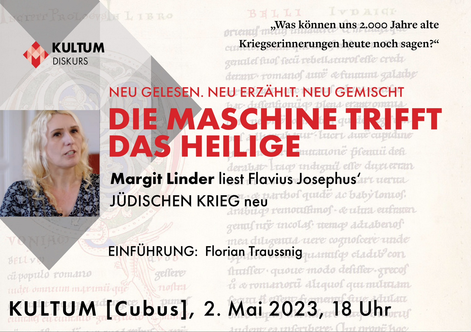 – In der „nach hinten“ blickenden, aber die Gegenwart mit diesem historischen Rückspiegel abgleichenden Reihe Neu gelesen. Neu erzählt. Neu gemischt. waren 2023 mehrere Experten zu Gast. Sie kontextualisierten historische Texte mit unserem aktuellen Erlebnis- und Erkenntnishorizont: Althistorikerin Margit Linder sprach am 2. Mai über Flavius Josephus‘ antiken Antikriegsbericht De Bello Judaico, der Byzantinist und Klimahistoriker Johannes Preiser-Kapeller zog am 17. Oktober in seiner Neu-Lesung mittelalterlicher Katastrophentexte spannende Vergleiche zum heutigen Klima-Aktivismus und in einem Talkformat sprachen Philosoph Reinhold Esterbauer und Journalistin Victoria Schwendenwein über La Mettrie’s Schrift Le Homme Machine und hochaktuelle Themen wie KI.