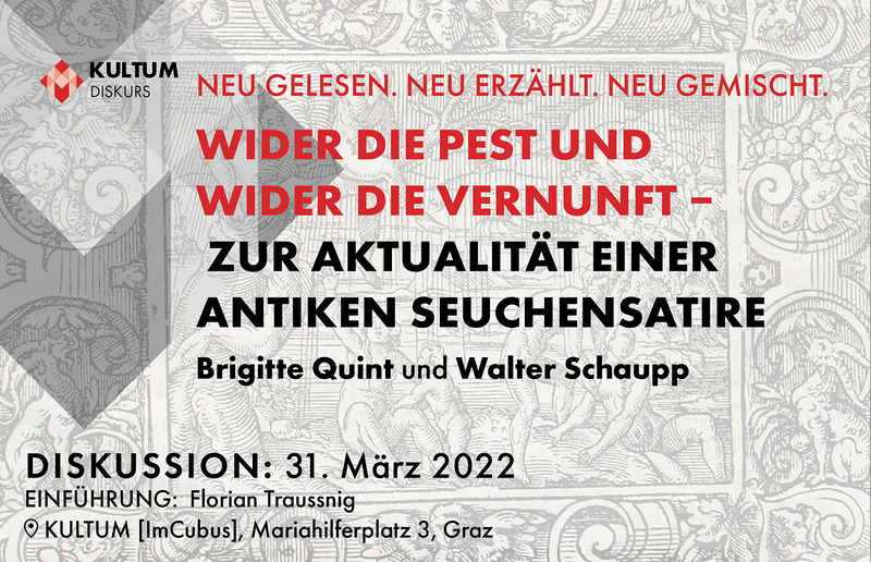Blickt man im seuchengeplagten Heute in den kulturgeschichtlichen Rückspiegel und liest man sich ein bisschen in alte Texte über Plagen-, Konflikt und Krisenzeiten ein, so „reimt“ sich für uns erstaunlich viel, so finden sich erstaunlich viele erhellende Analogien und Kontinuitäten, die für unsere aktuelle soziologische und politische Lage von großer Bedeutung sind. Gemeinsam mit der Journalistin Brigitte Quint (Die Furche) und dem Moraltheologen Prof. Walter Schaupp lesen wir daher Auszüge aus Lukians Samosatas Satire über den "spirituellen Influencer" Alexander, der während der rätselhaften Antoninischen Pest (~ 165-180 n. Chr.) vorgab, mit (wohl wirkungslosen, ja sogar gefährlichen) Orakelsprüchen und Mitteln gegen die Seuchen und Unbilden seiner Zeit zu wirken. Nicht nur weil derartige Ratschläge den dubiosen medizinischen Empfehlungen heutiger Rechtspopulisten und Corona-Maßnahmengegnerinnen verblüffend ähnlich sind fragen wir auf der Grundlage dieses Texts: Welche narrativen Bausteine finden sich, welche Konzepte, welche Dialektiken tun sich auf, wenn man alte und neue (Krisen-)Texte und Gedanken zusammenbringt? Unter dem Titel Wider die Pest und wider die Vernunft werden wir daher Lukians Seuchensatire neu lesen, sie gesellschaftspolitisch und moral(theolog)isch ausdeuten und auf Aktualitäts- und Zukunftsbezug abklopfen. Was kann uns so ein überlieferter Krisentext heute zeigen? Was kann er uns sagen? Was für die Zukunft mitgeben?