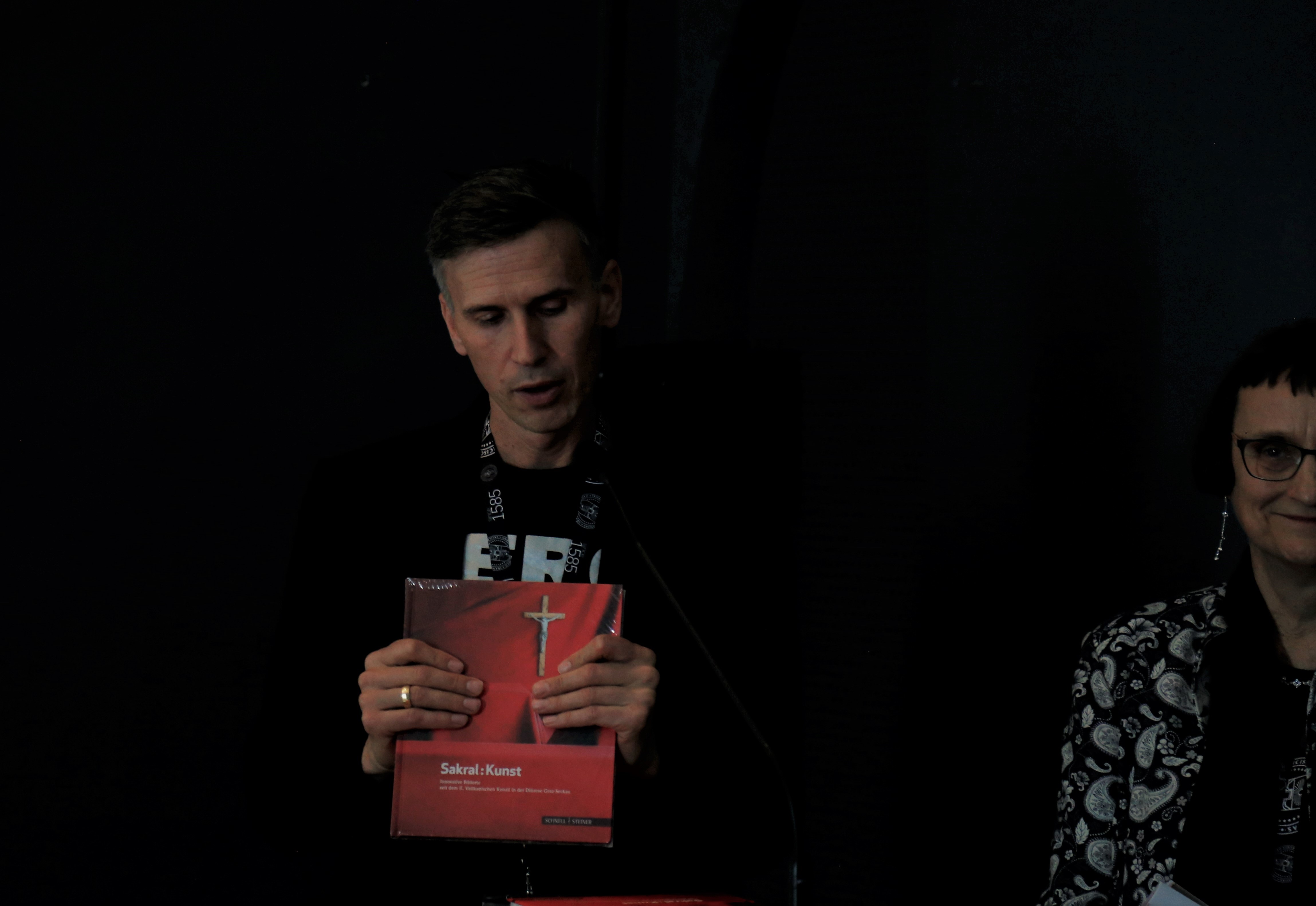 Umso erfreulicher, so der Gastgeber, sei die Abhaltung des Auftaktpanels der englischsprachigen Konferenz über regionale nationalsozialistische und sowjetische Lager in Österreich während und nach dem Zweiten Weltkrieg im KULTUM. Dieser monastisch definierte und gleichzeitig zeitgenössisch-humanistisch ausgerichtete Ort eigne sich gerade wegen der mitunter problematischen Institutionsgeschichte der Kirche hervorragend zum lauten Nachdenken über die ethische Dimension von Lagern und repressiven Behausungen aller Art. Dem menschenrechtlich engagierten Mitinitiator der Tagung, Don Walicek, überreichte Traussnig das Buch Sakral:Kunst, das zeigt, wie konsequent, selbstkritisch und innovativ sich die Katholische Kirche Steiermark in den letzten 50 Jahren dem offenen Dialog mit der modernen Welt und der Kunst gestellt hat und noch immer stellt. Moderne Kunst, sichtbar etwa in Manfred Erjautz‘ laufender KULTUM-Ausstellung Dinge/Things, fungierte gleich als zweifacher, also künstlerischer und ideengeschichtlicher „Opener“ für das Diskurspanel: Roberta Maierhofer ging in ihrem Eröffnungsstatement sogleich auf die eindringliche Erjautz-Skulptur Blindflug ein und verwob das aus der Geschichte bekannte blinde Hineingleiten in einen Weltkrieg mit den existenziellen Ängsten und Ungerechtigkeiten unserer Ära.