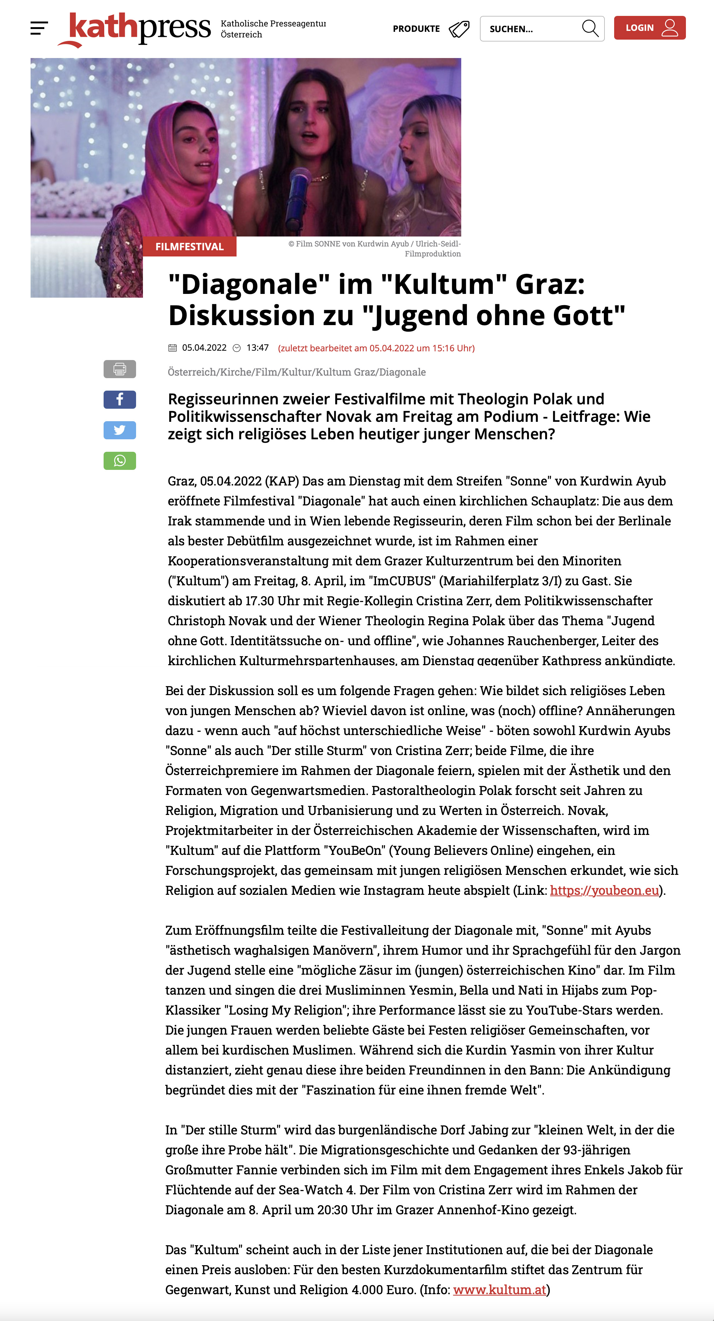 Kurdwin Ayub ist einer der vier Podiumsgäste, die am 8. April im Cubus über Religion und ihre Sichtbarkeit online als auch offline spricht, im Fokus: Jugendliche und der möglicher Generationenbruch. Tiefe Einblicke über das Zusammen- und Auseinanderleben dreier Generationen gibt Regisseurin Cristina Zerr in ihrem Film Der stille Sturm. Sie begleitet ihren Partner Jakob in das burgenländische 700-Seelendorf Jabing. Die Migrationsgeschichte und Gedanken der 93-jährigen Großmutter Fannie, verwebt sie fein mit dem Leben ihres Enkels Jakob, der Flüchtenden auf der See-Watch 4 vor dem Ertrinken zu retten versucht. Im zeitlichen Kontext der Pandemie, die das Auslaufen der Sea-Watch 4 verzögert, eingebettet in die Enge eines christlich geprägten Dorflebens mit konservativen Traditionen wirft die Regisseurin einen Blick auf die Kommunikation zwischen den Generationen – per Telefonkonferenz über die Meere und vor Ort – Wertevorstellungen und Barmherzigkeit. Podiumgast Christina Zerr wird darüber sprechen, wie sich im kleinen Ort die Widersprüche der großen Welt offenbaren.